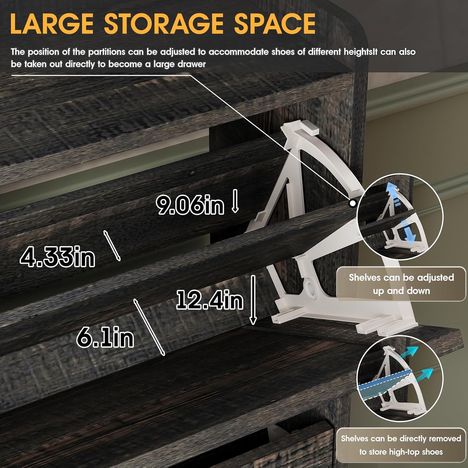 - Large Capacity Shoe Cabinet: The drawer shoe cabinet can store up to 28-36 pairs. There are three upper and lower drawers, each drawer contains two layers of storage space. The panel can be adjusted or removed in two grooves to accommodate different heights and sizes of flats, mid boots or heels! Slippers or sweeping robots can be placed on the bottom. There is a fence on the top, ideal for placing potted plants, ornaments, socks and keys, without worrying about falling