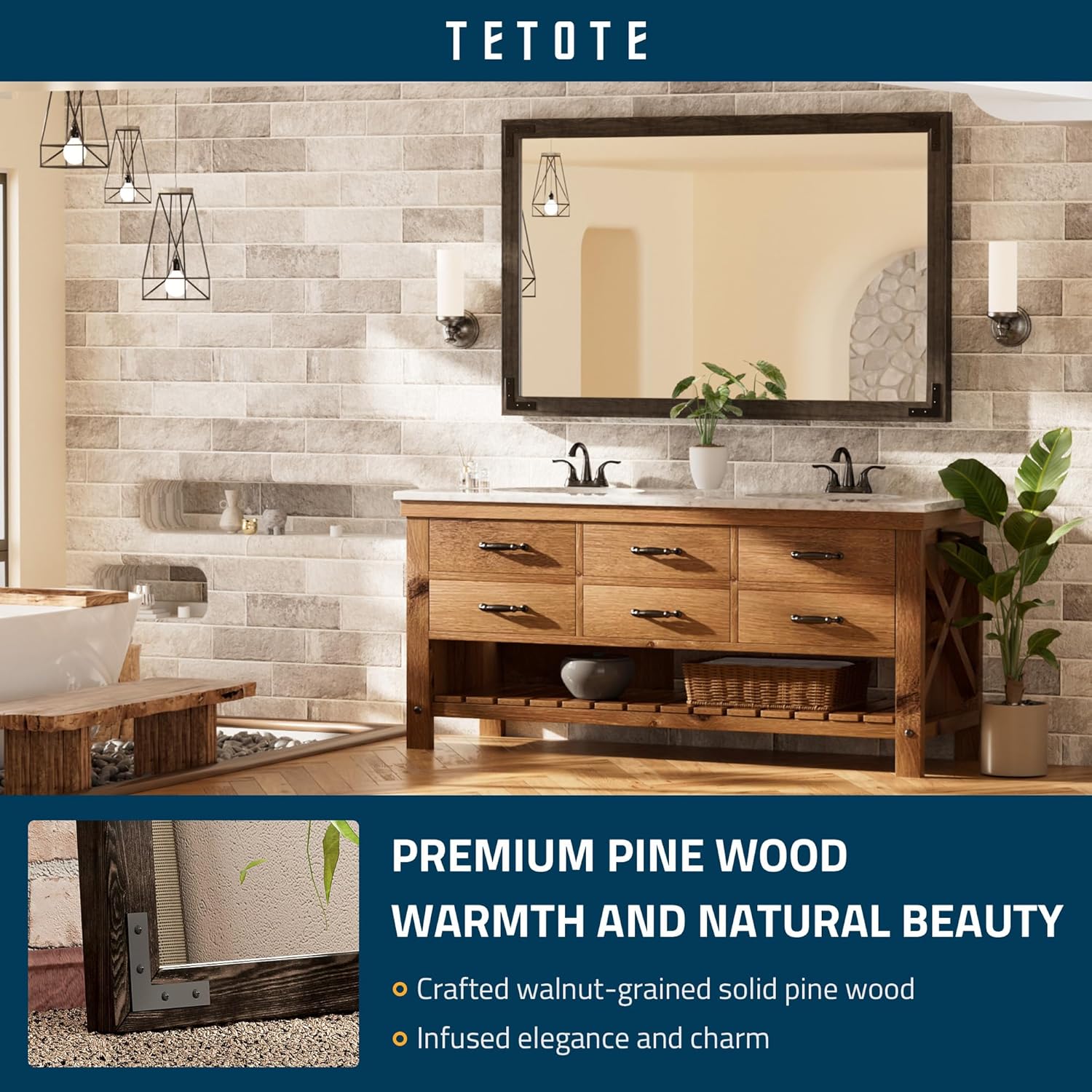 - 【Rustic Pine Solid Wood Frame】TETOTE rustic black wood framed mirror for bathroom sink is made of premium pine solid wood, and its natural pine grain is full of rustic chic charm and farmhouse warmth, making it a great addition to brighten up your house in the bathroom, bedroom, living room, entryway, or anywhere. Due to the color of the wood itself, there may be a slight color difference when purchasing 2 pieces at the same time.