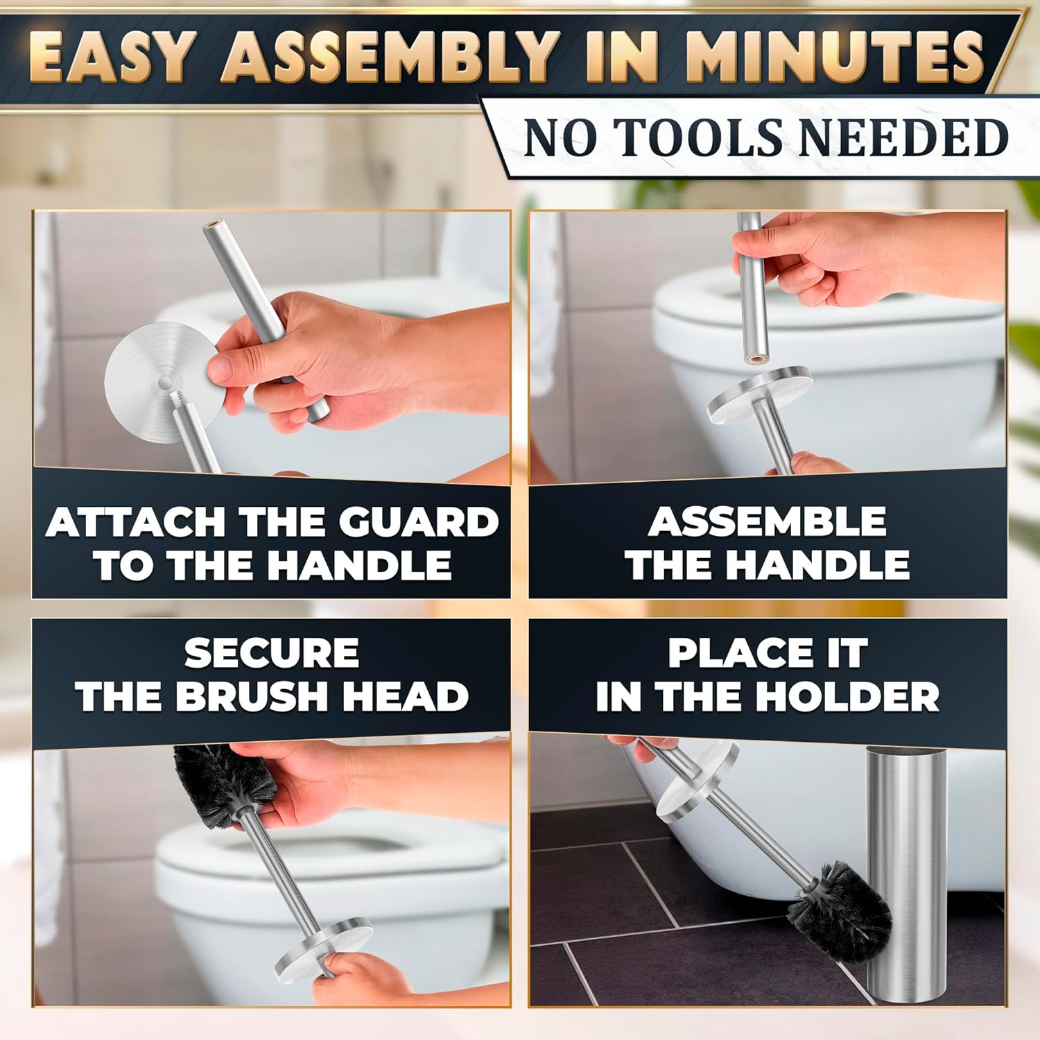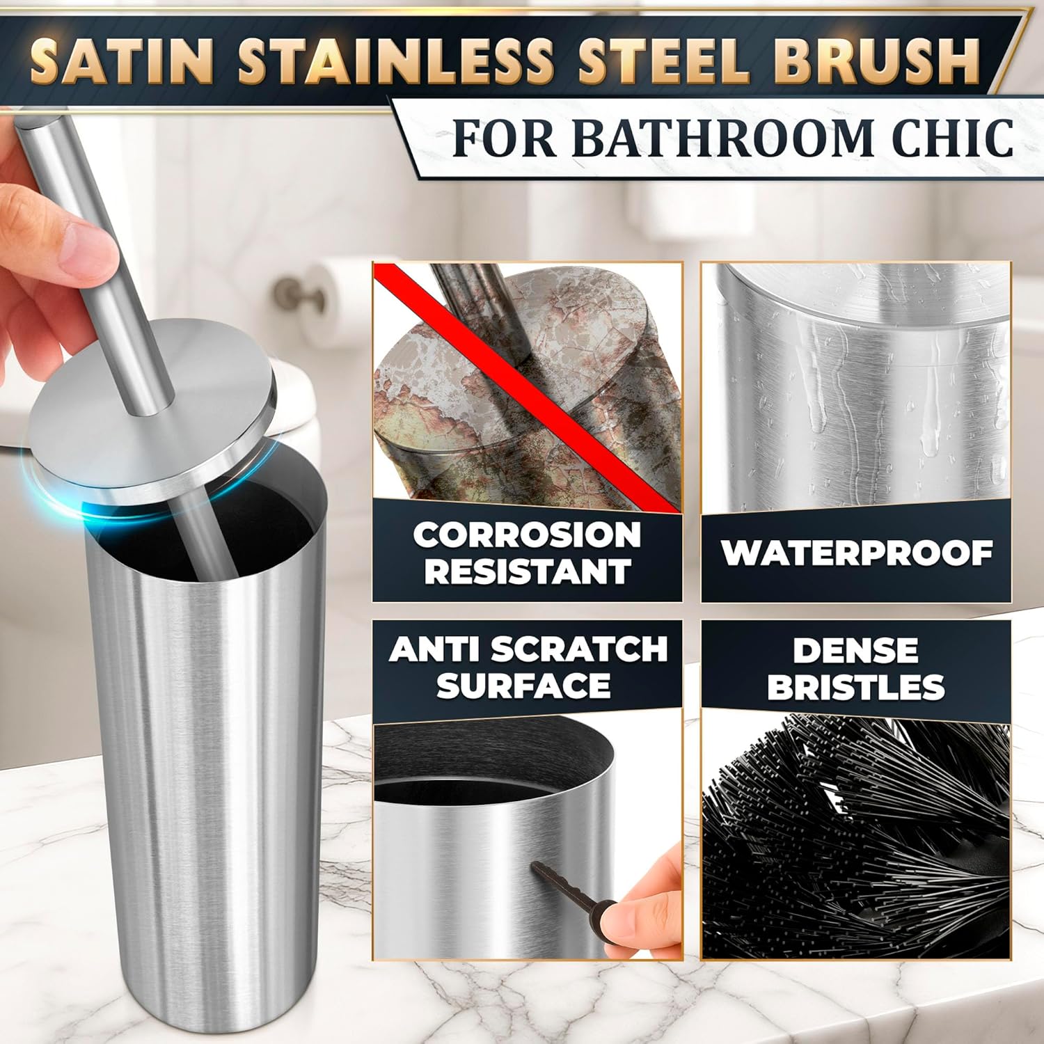 - Anti-Splash Bathroom Toilet Cleaner Brush: Our toilet brush and holder set stainless steel features a protective cover on the handle that shields your hands from splashes for a hygienic cleaning