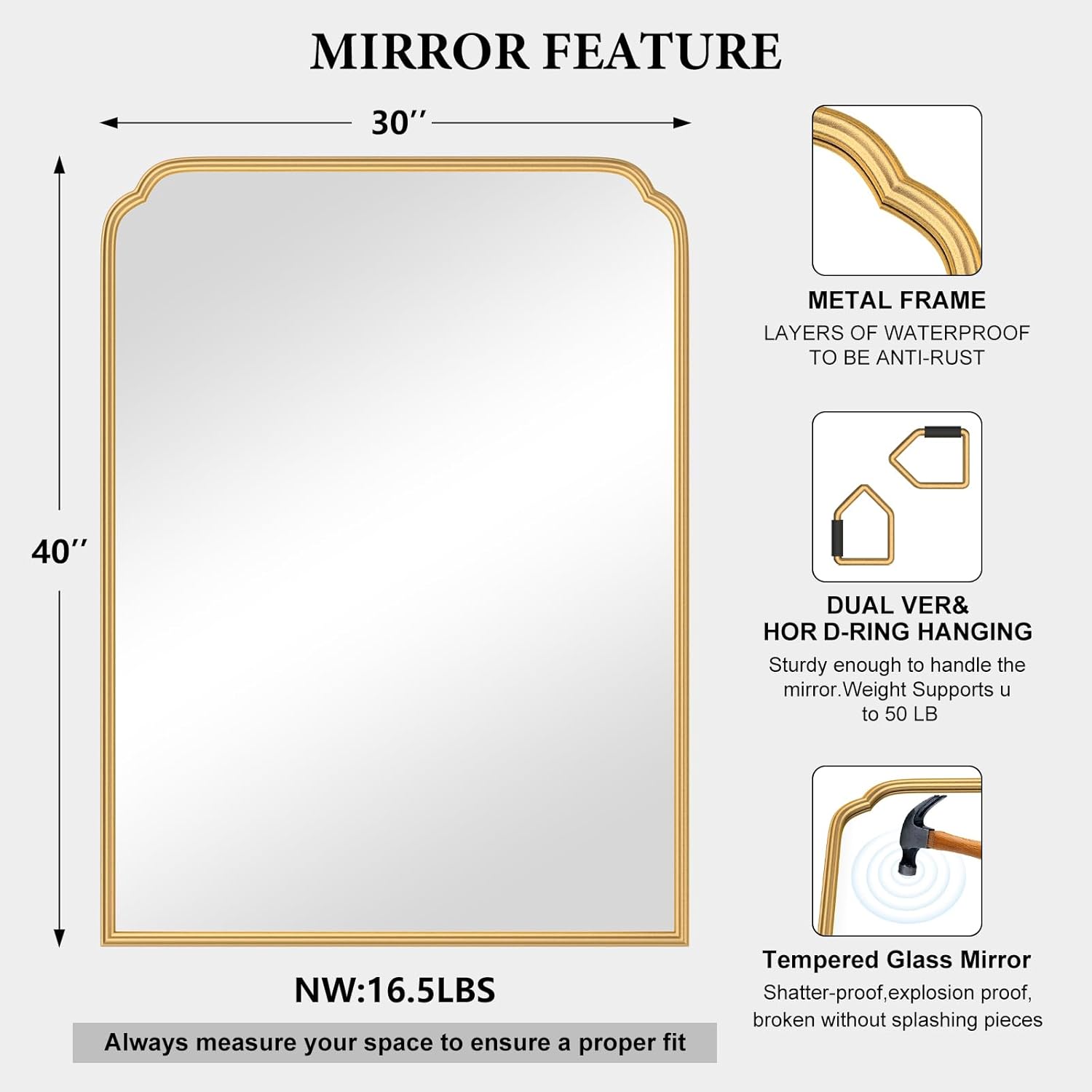 - 【Multi-size Design】Gold wall mirror 30×40 inch. Multi-Size Design offers both gold and black colors for coustomer to choose from. Meets the decor needs to industry, rustic and modern style of bathroom, Multi-scene use for bathroom,bedroom,living room,hotel or salon.