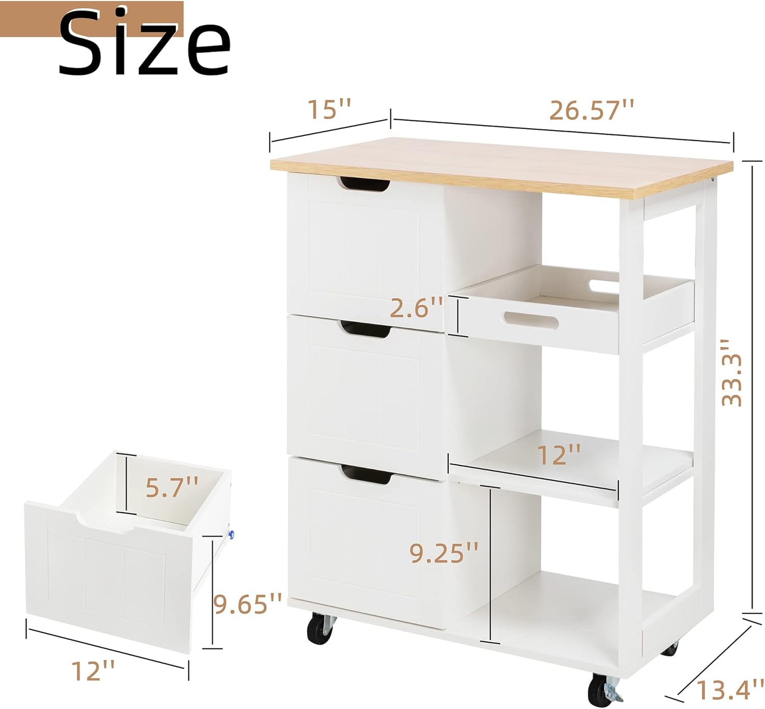 Shintenchi Kitchen Island Cart with Storage,Rolling Kitchen Island Storage Cabinet,Side Table on Wheels with Worktop,3 Open Shelves and 3 Drawers for Kitchen,Dinning Room, White