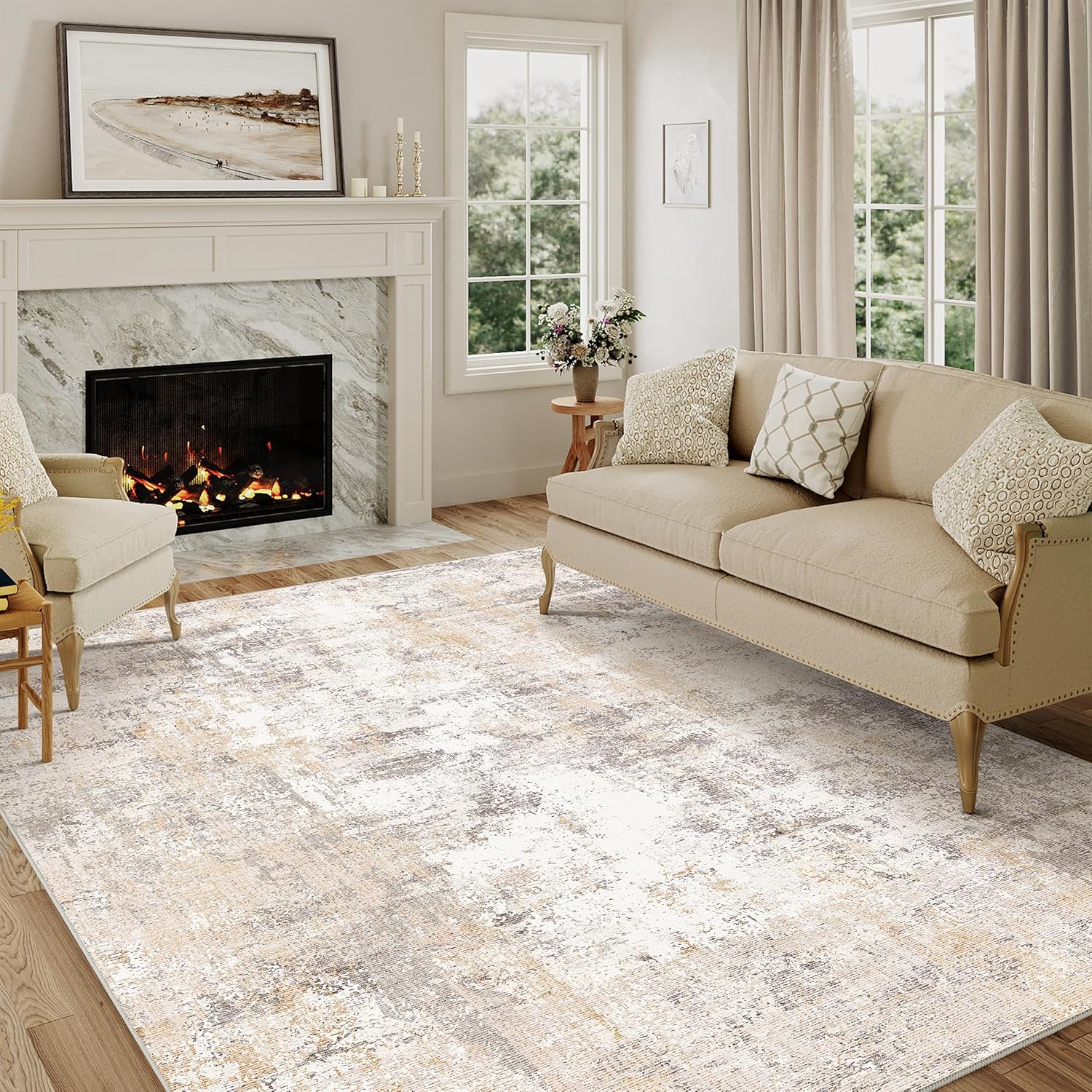 5x7 Washable Area Rug Beige Grey Neutral Abstract Living Room Bedroom Throw Rug Non Slip Soft Low Pile Indoor Floor Carpet for Dining Room Kitchen Office Entryway Home