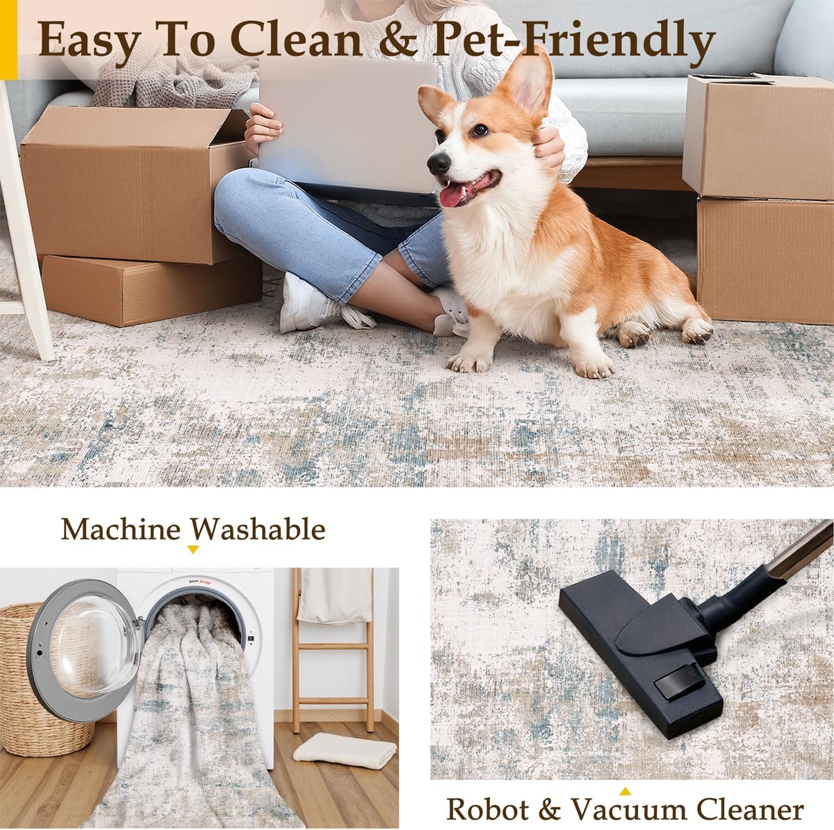 8x10 Washable Area Rug Beige Blue Neutral Abstract Living Room Bedroom Large Throw Rug Non Slip Soft Low Pile Indoor Floor Carpet for Dining Room Kitchen Office Entryway