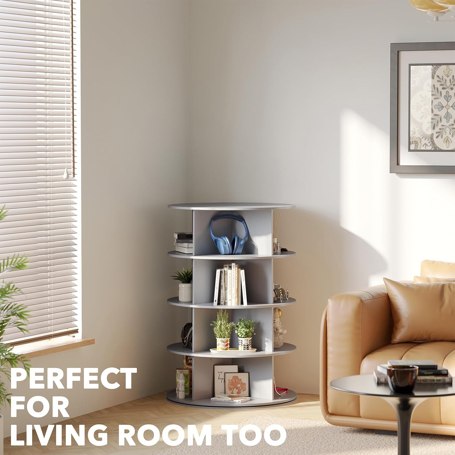- ORGANIZED AND BEAUTIFUL - Make your shoes neat and organized with this rotating shoe rack tower lazy susan; The space saving design can hold up many shoes or bags in a compact space; SIZE: 23.2"W x 23.2"D x 36.5"H