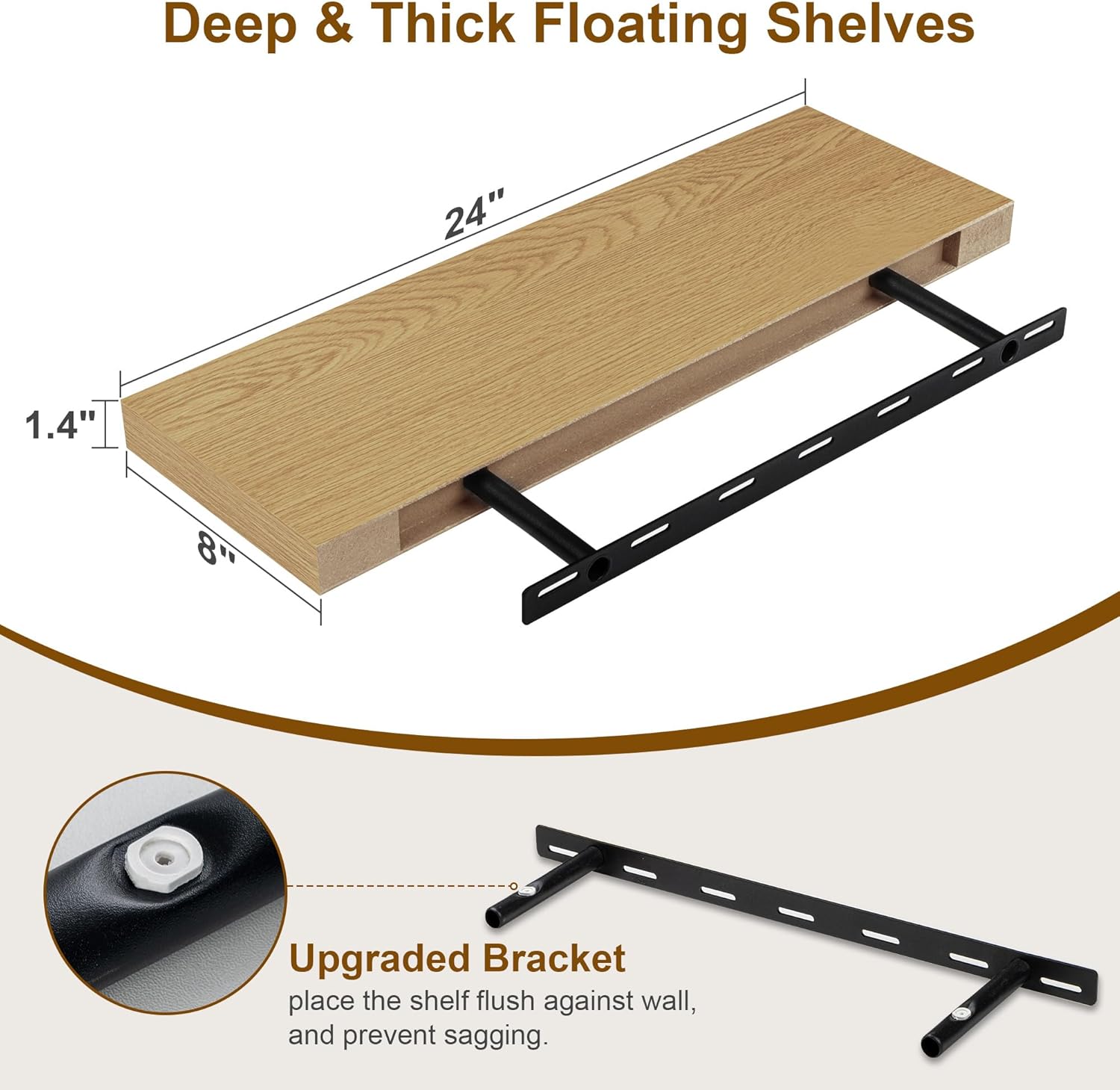 - ă8 INCH DEEP FLOATING SHELFăThis extra deeper and thicker wall shelves are 8 inches in depth and 1.4 inches in thickness instead of the regular narrow floating shelves, you can put photos, pictures, DVD players, videos, books, toys, and some other knickknack on this beautiful display wooden shelf.