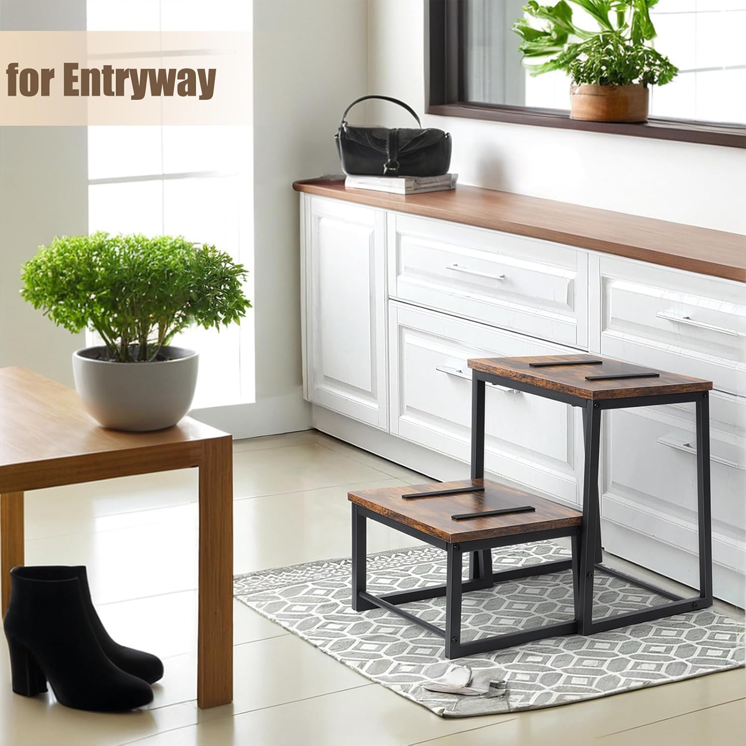 - 【Multi-Purpose 2 Step Stool】This wood step stool is suitable for various scenarios in the home, it can be placed in the bedroom, bathroom, kitchen, garden, used as a bathroom footstool for brushing teeth or washing hands, used as a kitchen cabinet footstool, used as a bedroom bed step stool for high beds, and used as a closet footstool for bedroom closets. In addition, this stool can be used as a toilet training tool, a plant stand, or an entryway shoe bench.