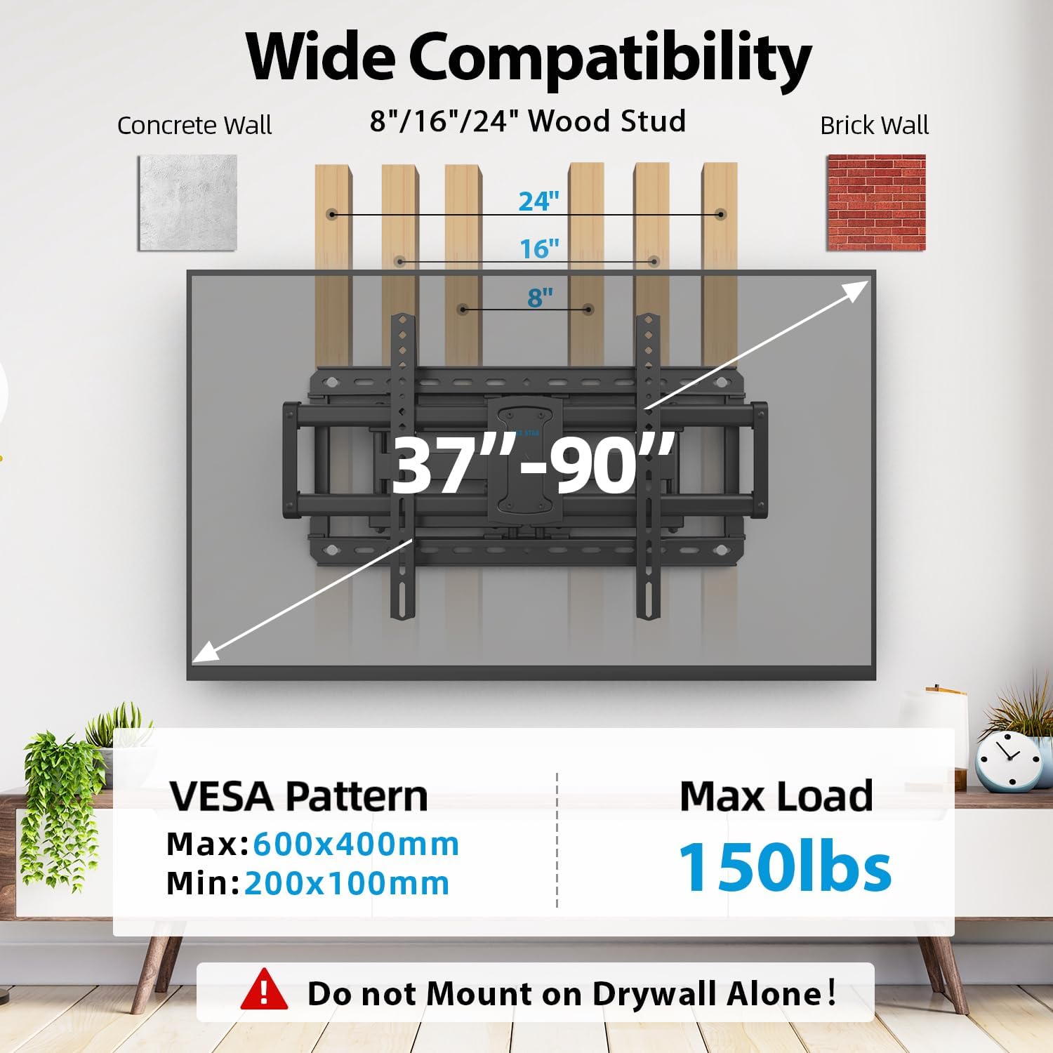- 【TV MOUNT COMPATIBILITY】: Our wall mount bracket fits for most of 37"-90" screen sizes TV, TV weight capacity up to 150lbs, it supports 12" 16" 24"wood studs,solid concrete wall and brick wall. Don't mount directly on drywall without wood studs