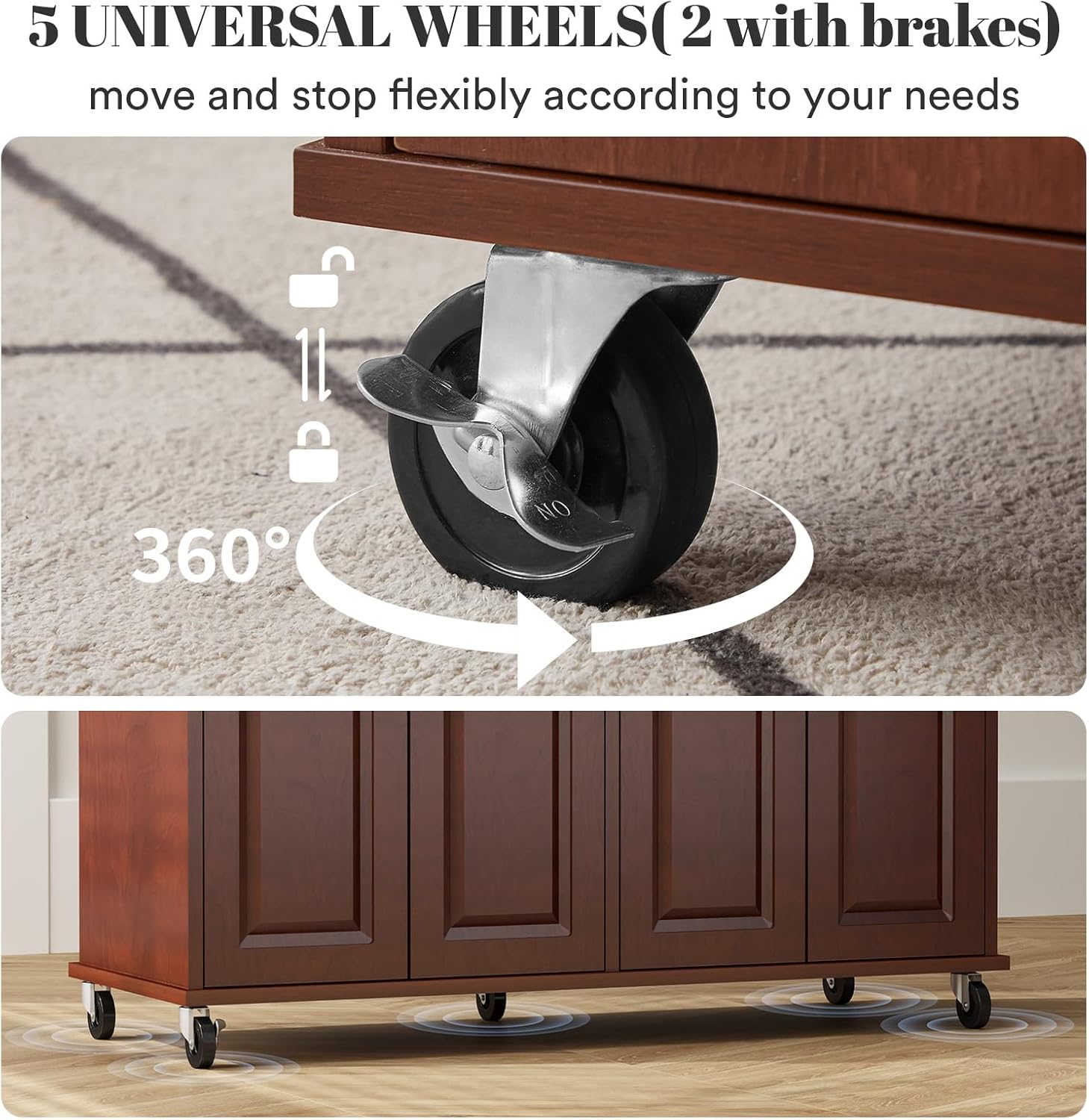 - ăKITCHEN ISLAND ON WHEELSăThe bottom of the mobile kitchen island has 5 universal wheels( 2 with brakes), so it can move and stop flexibly as you need, and go anywhere according to your space requirements.
