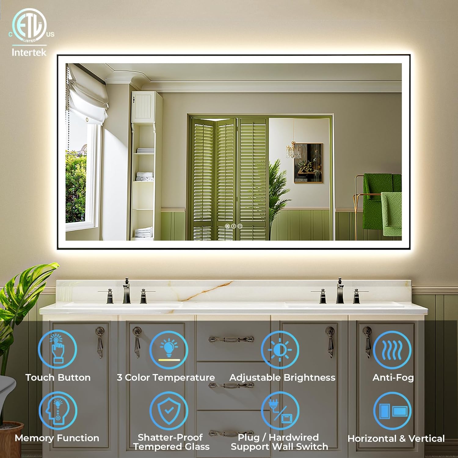 - 🔱【Easy to Install & Plug/Hardwired】- Just fix the French Cleats to the wall with screws, and then hang this black bathroom mirror on it. Can be plugged into an outlet or hardwired to a wall switch. It is better done by a professional electrician if you want to hardwire it.
