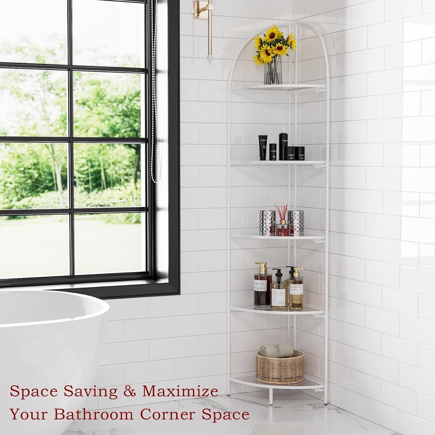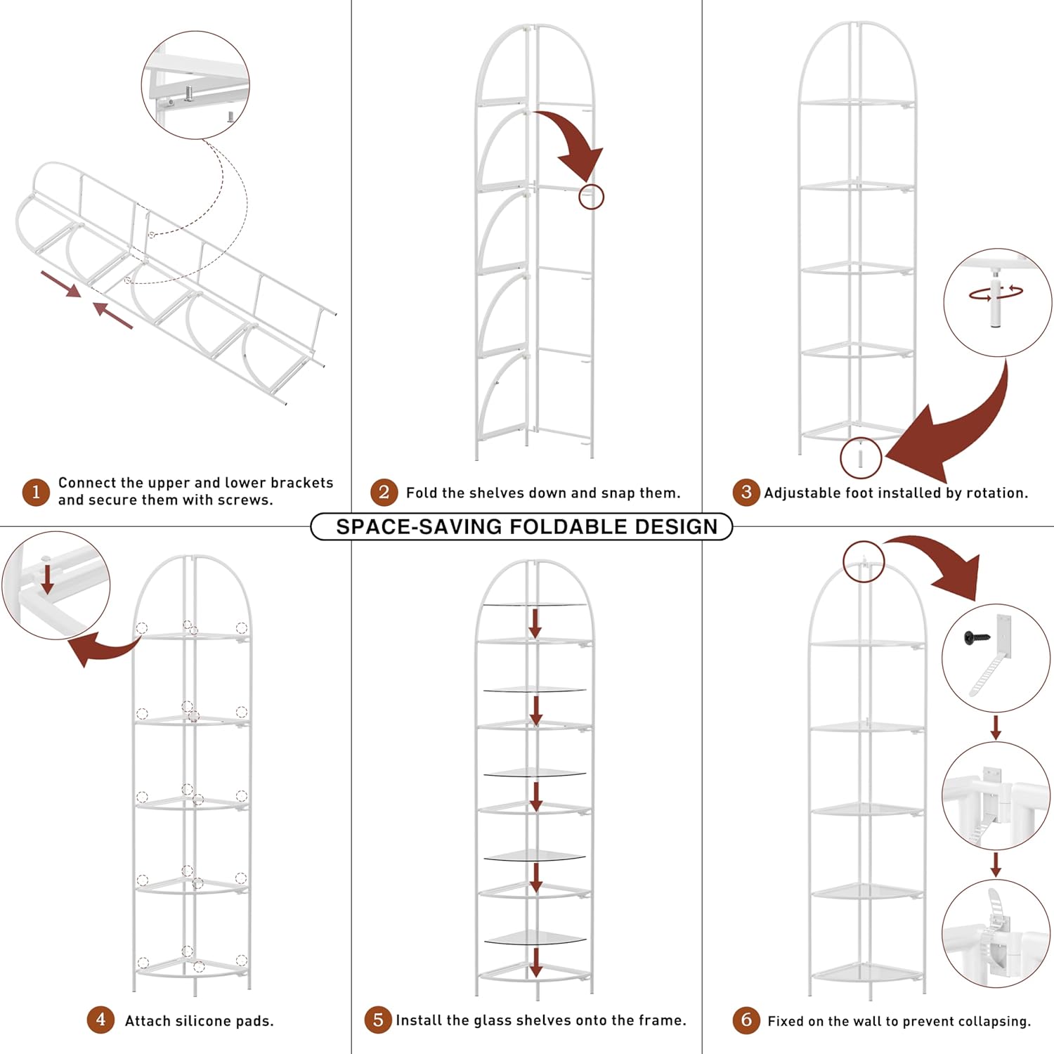 Crofy Foldable 5 Tier Corner Shelf, Metal Corner Plant Stand with White Frame and Transparent Shelves, Corner Display Rack Multipurpose Shelving Unit for Living Room, Bedroom, Bathroom