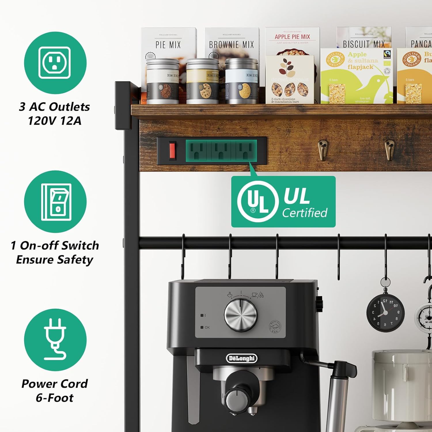 - Convenient Power Outlets -- Our bakers rack equipped with 3 AC outlets & 1 on-off switch, allowing you to easily use electrical appliances without worrying about a shortage of outlets or their distance. The outlets are designed at a reasonable height, so you don't have to bend down to plug/unplug. And keep out of reach of children and pets. It is very safe and accessible to use
