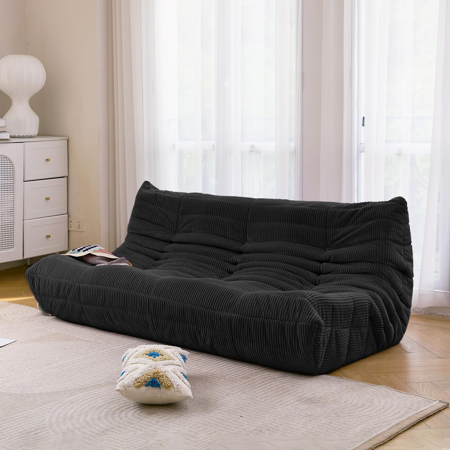 N&V Fireside Three Seater Sofa, Mid Century Armless Twin Size Floor Sofa, Soft Premium Corduroy Floor Lounge Chair, Foam Sofa Accent Chair for Living Room, Bedroom (Black)