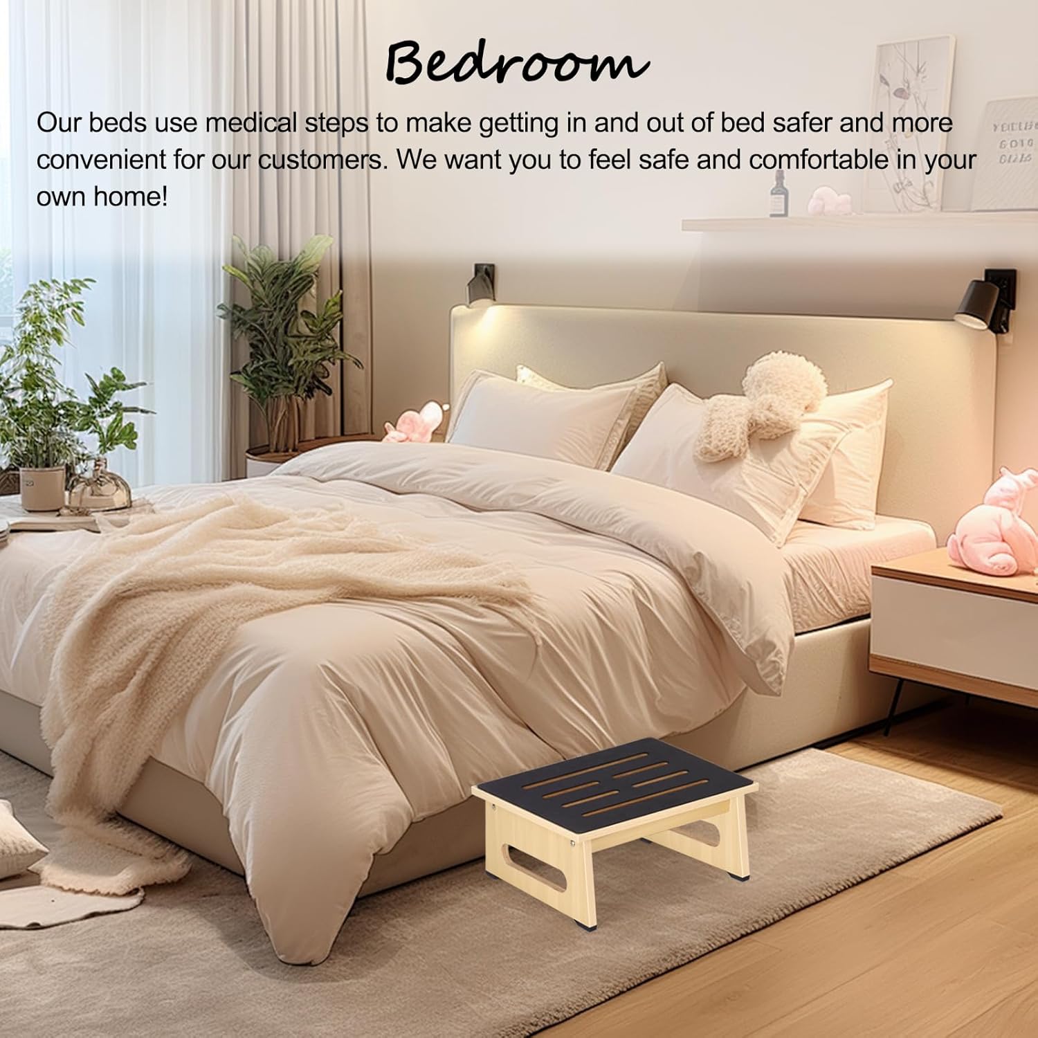 One Step Stool with Non-Slip Rubber Stepping Feet, Heavy Duty Wooden Step Stools, 450 LB Portable Bed Steps for High Beds for Bathroom, Bedroom, Kitchen & Bedside Support