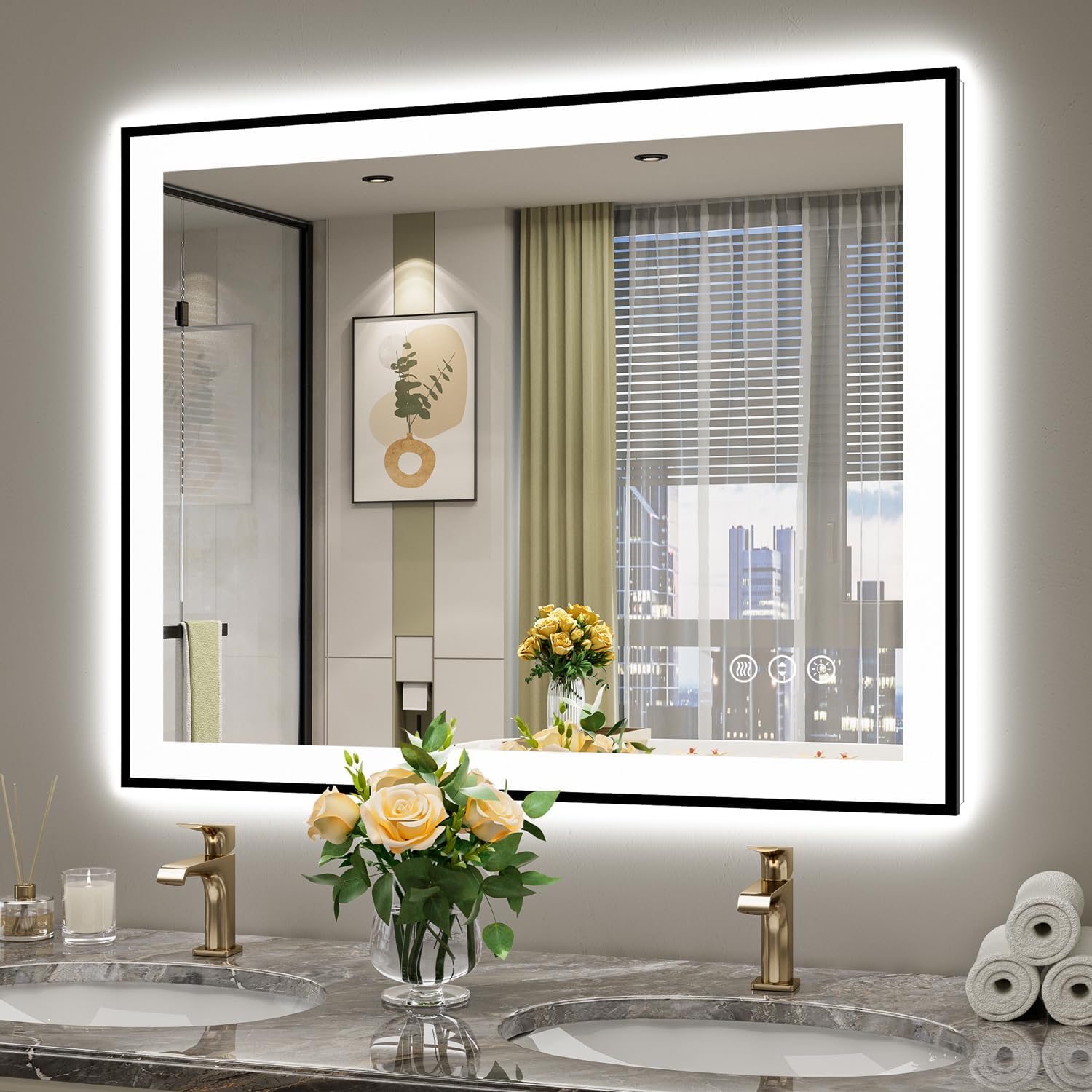 40x32 Inch LED Bathroom Mirror with Lights (Front Lit and Backlit) Black Framed Lighted Vanity Mirror for Bathroom Wall Dimmable Anti-Fog Memory Tempered Glass Horizontal/Vertical