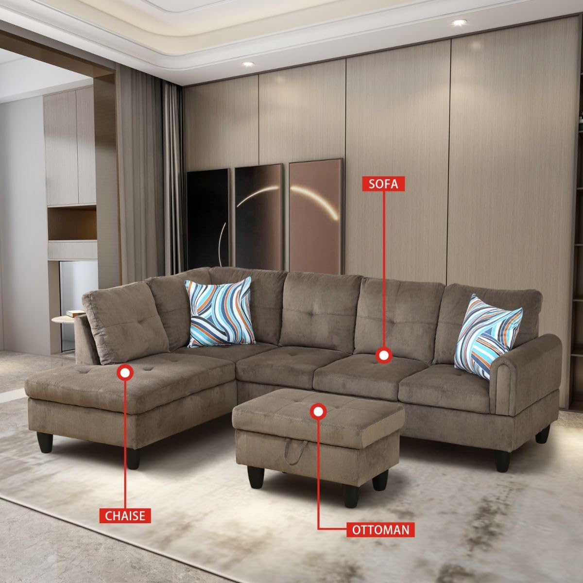 Brown L-Shaped 3-Piece Corduroy Sofa with Storage Ottoman Set, Sectional Couch Sofa Set for Living Room, Office, Small Space