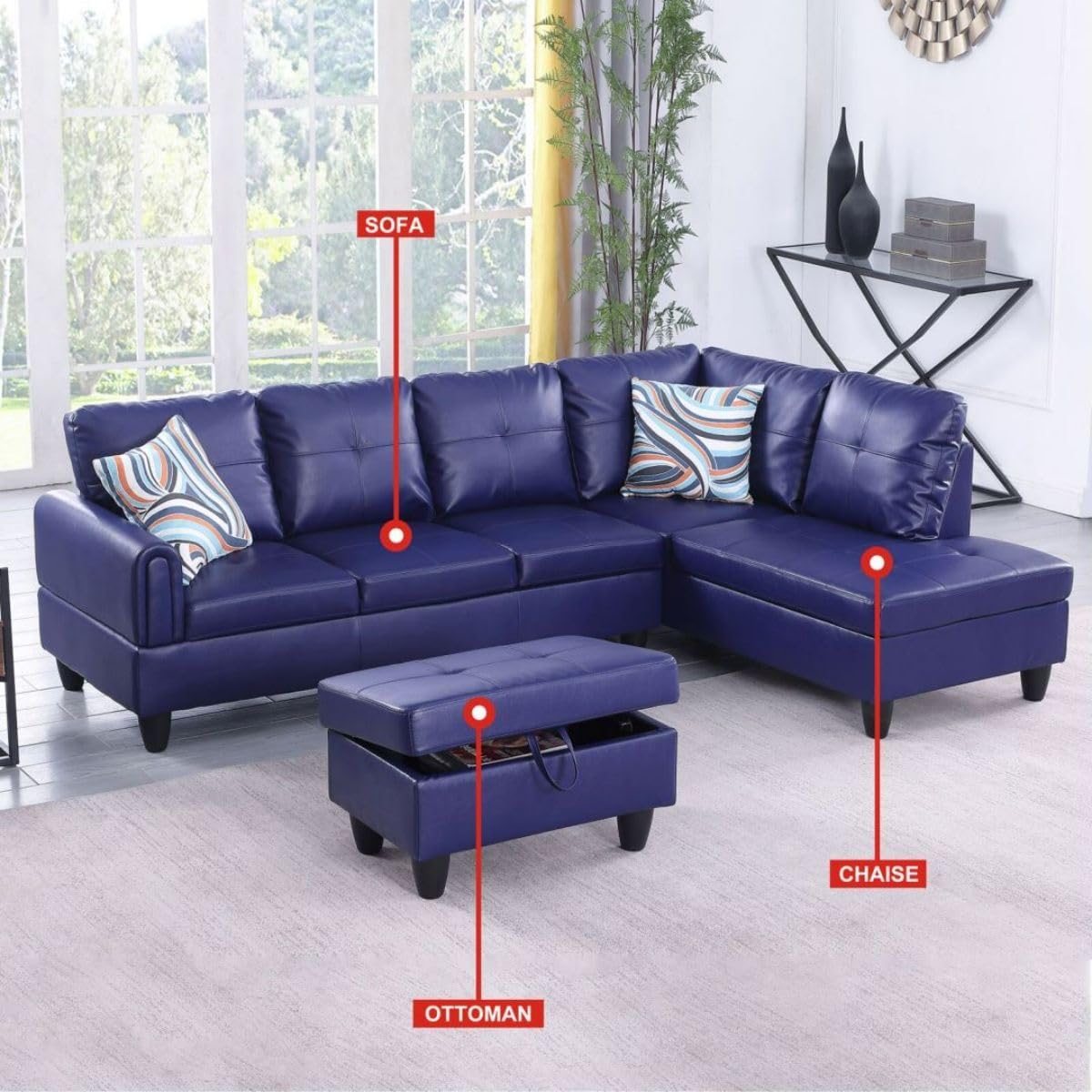 Blue L-Shaped 3-Piece Faux Leather Sofa with Storage Ottoman Set, Sectional Couch Sofa Set for Living Room, Office, Small Space