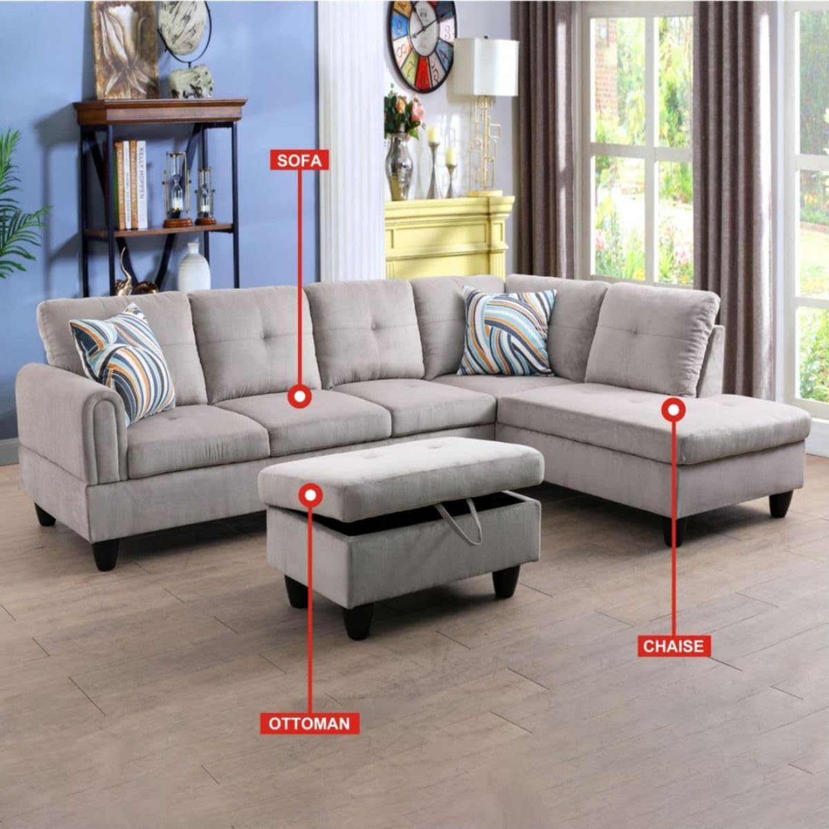 Grey White L-Shaped 3-Piece Corduroy Sofa with Storage Ottoman Set, Sectional Couch Sofa Set for Living Room, Office, Small Space