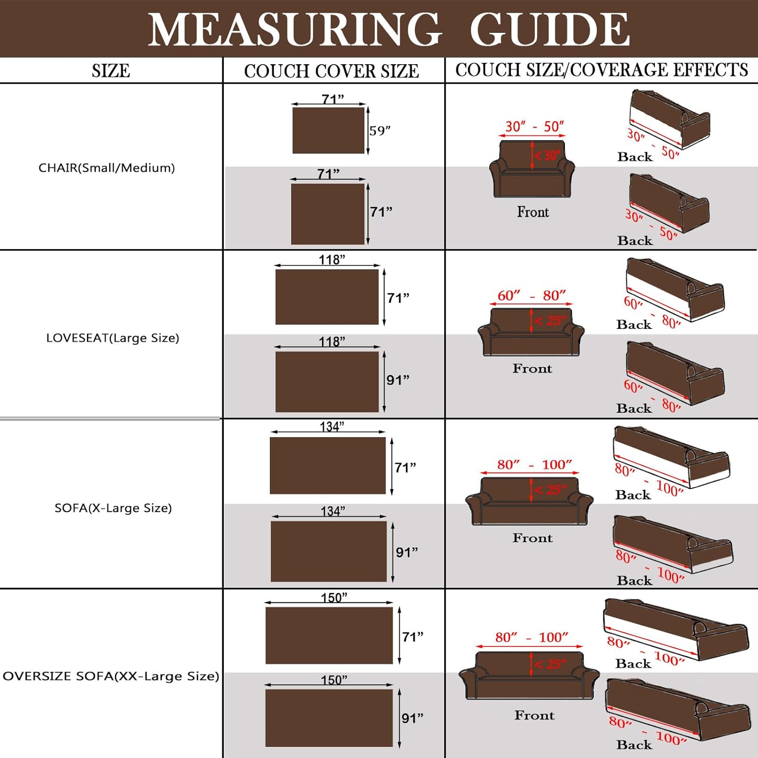 - HOW TO CHOOSE: Please measure your furniture before you buy. We recommend Small Size 59"x 71"for chair/recliner; Medium Size 71"x 71"for Large chair/recliner; Large Size 71"x 118 " / 91"x 118 "for loveseat; X-Large Size 71" x 134" / 91"x 134"for sofas; XX-Large Size 71" x 150" / 91"x 150"for oversize sofas; Suitable for most couch, Provide perfect coverage for the sofa (including armrests)