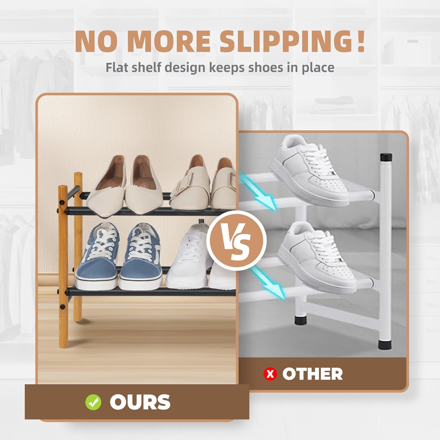 - Expandable and Adjustable: This expandable shoe rack adjusts from 18.7" to 33.86", accommodating 4-8 pairs of shoes. Perfect as a small shoe rack for compact spaces or for expanding to fit more shoes.