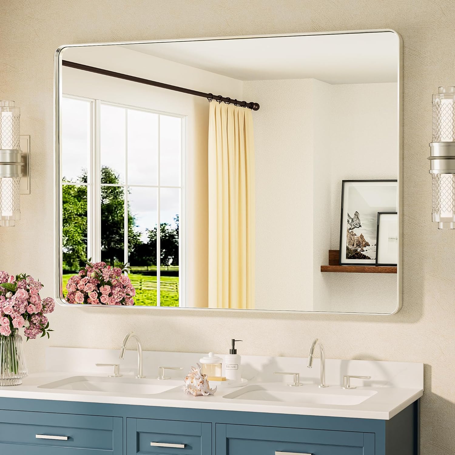 - 【Timeless Design with a Modern Touch】The combination of rounded corners and a floating mirror in this design perfectly marries classic elements with contemporary style. This thoughtful construction not only enhances tactile comfort but also creates a sense of visual expansiveness, while the integrated frame of this bathroom vanity mirror elevates the overall aesthetic appeal.