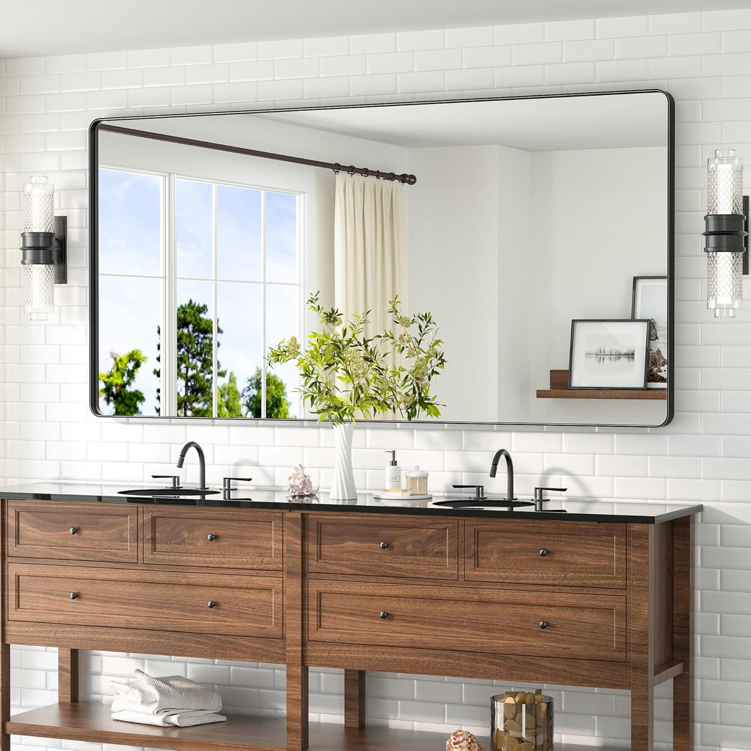 - 【Timeless Design with a Modern Touch】The combination of rounded corners and a floating mirror in this design perfectly marries classic elements with contemporary style. This thoughtful construction not only enhances tactile comfort but also creates a sense of visual expansiveness, while the integrated frame of this bathroom vanity mirror elevates the overall aesthetic appeal.