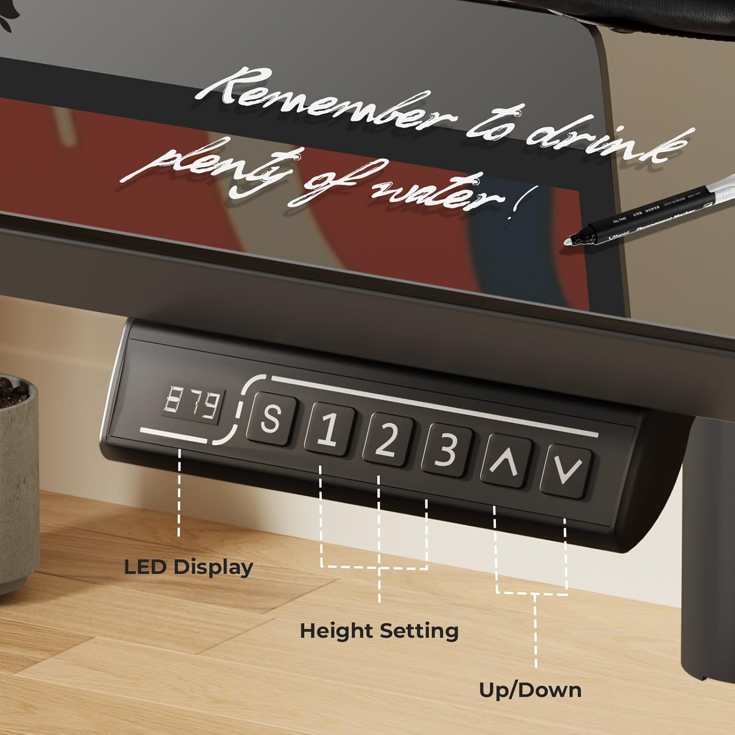 - Durable Glass Tabletop: The tempered glass desktop adds elegance and durability to the electric standing desk. Write or doodle on it with dry erase markers, then simply wipe clean to start fresh. More scratch resistant than wood boards
