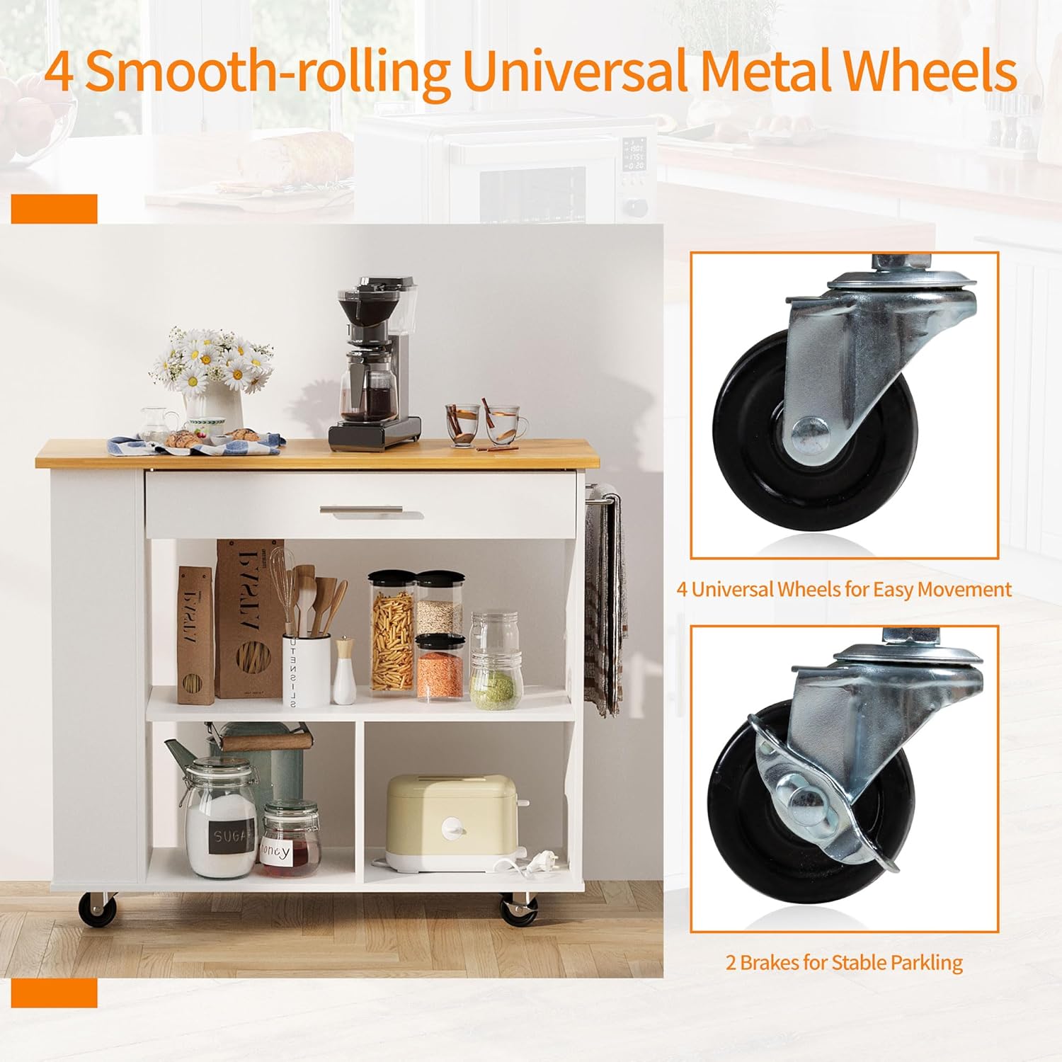 - 【Easy Mobility and Parking】This kitchen island cart on 4 smooth rolling wheels make it move freely. Also 2 wheels with brake design allows the island can be parked stably. You can always move and park it to keep everything in need always on your hand
