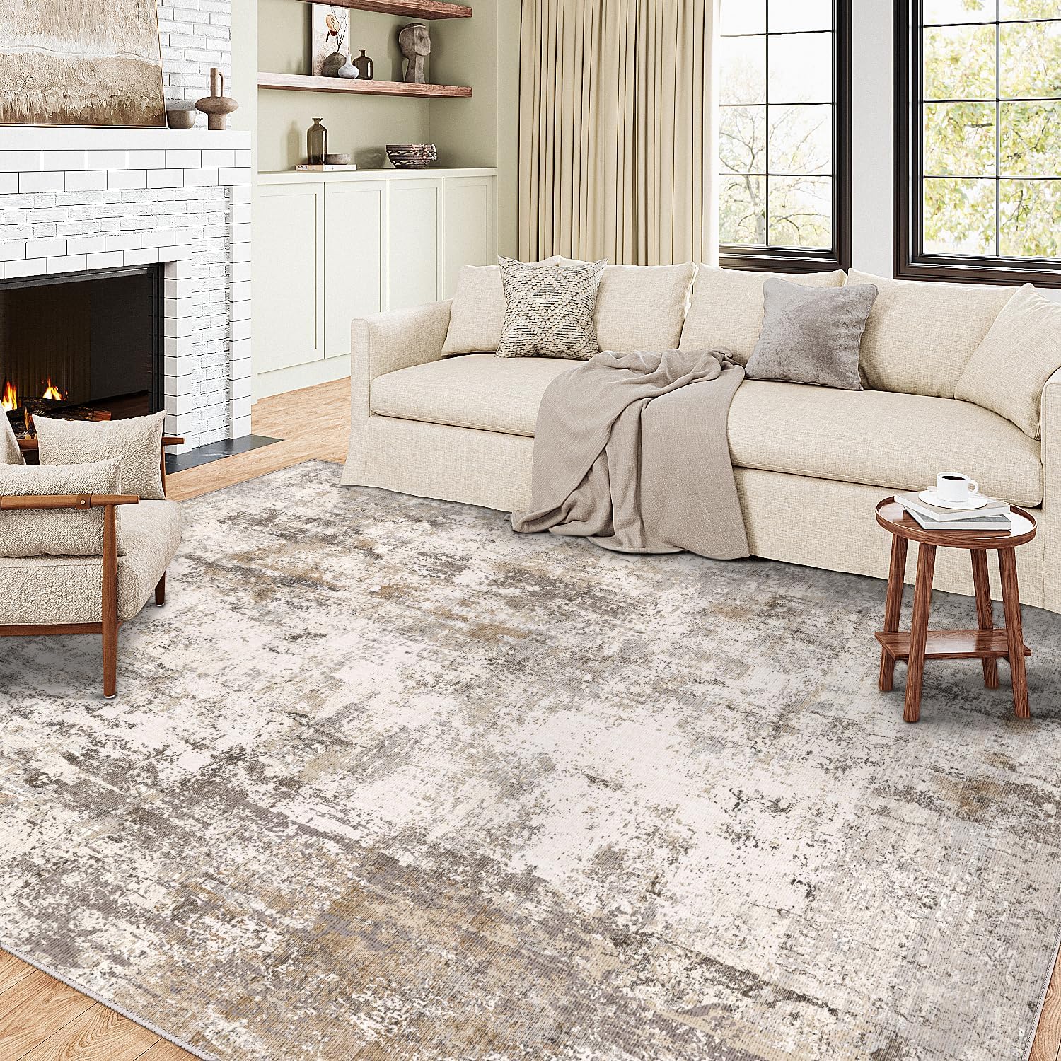 9x12 Washable Area Rug Brown Grey Neutral Abstract Living Room Bedroom Large Throw Rug Non Slip Soft Low Pile Indoor Floor Carpet for Dining Room Kitchen Office Entryway