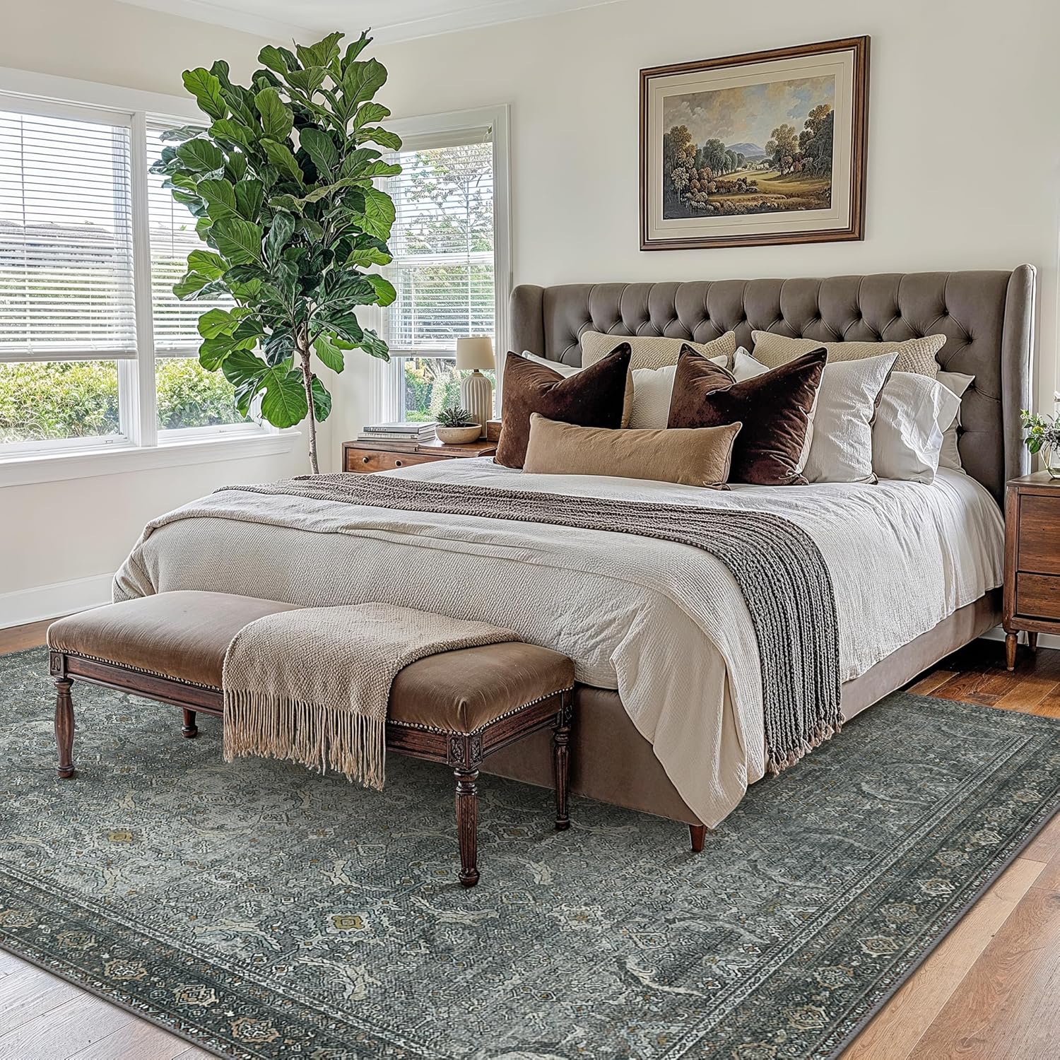 8X10 Area Rugs Machine Washable Rugs for Living Room, Vintage Boho Large Rugs for Bedroom Dining Room, Non Slip Indoor Soft Distressed Lightweight Thin Low Pile Carpet, Slate Grey
