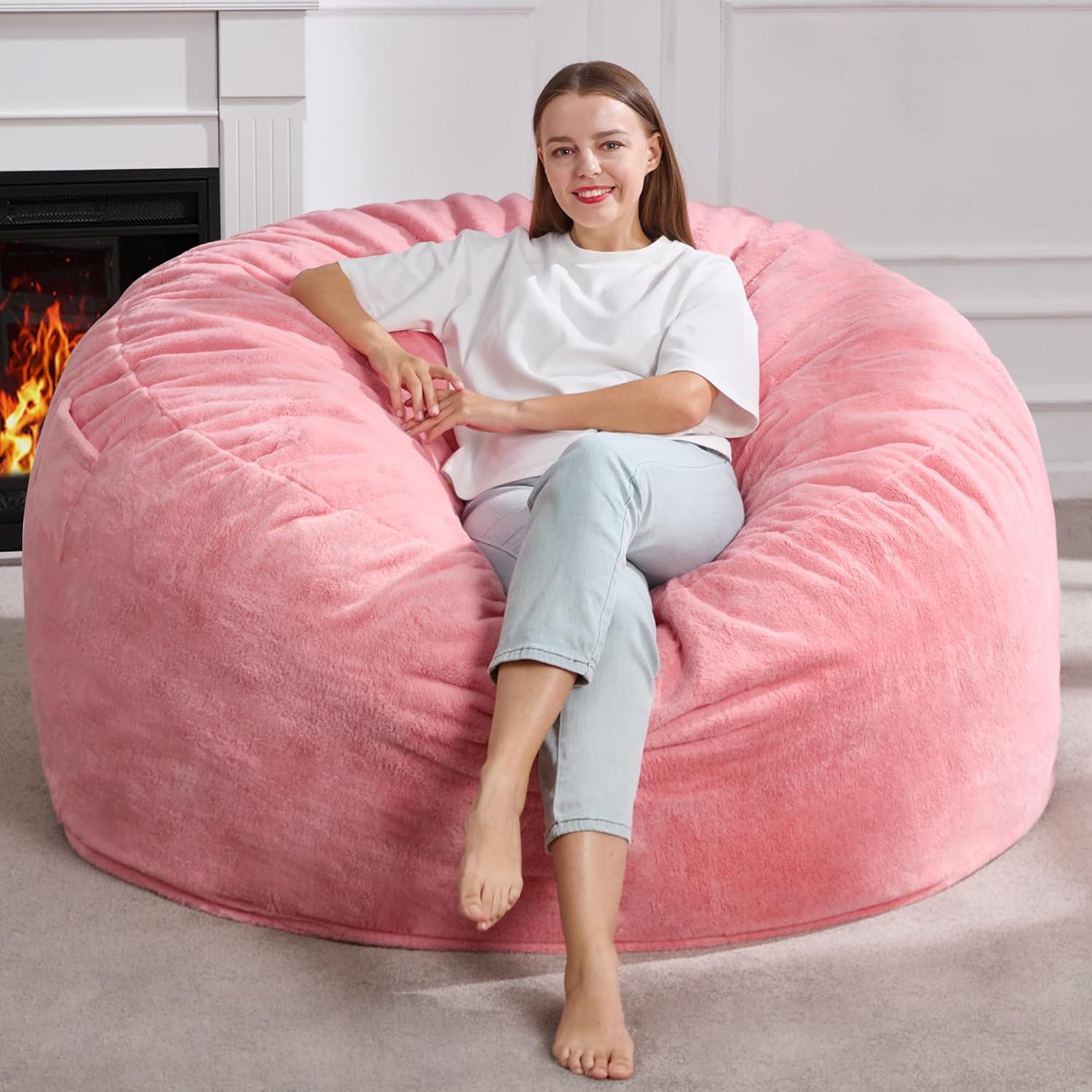 Hobestluk 5ft Bean Bag Chairs for Adults Large Beanbag Chair with Plush Faux Fur Cover Big Bean Bag Chair for Living Room Bedroom Dorm Office - Pink (50” x 50” x 24”)