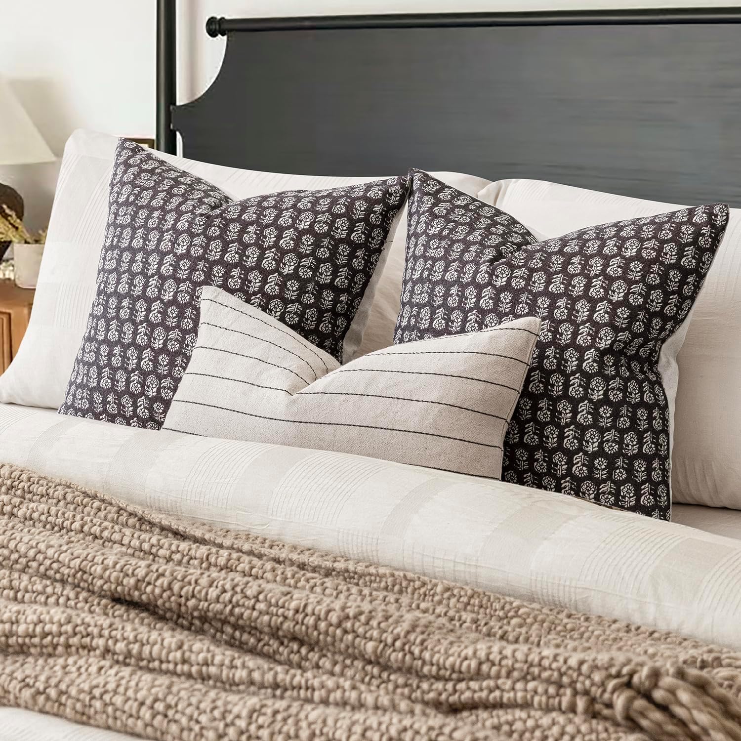 Foindtower Set of 2 Decorative Neutral Floral Print Throw Pillow Covers Vintage Accent Farmhouse Cushion Covers Boho Home Decor for Sofa Couch Chair Bedroom Living Room Outdoor,18×18 Inch,Black