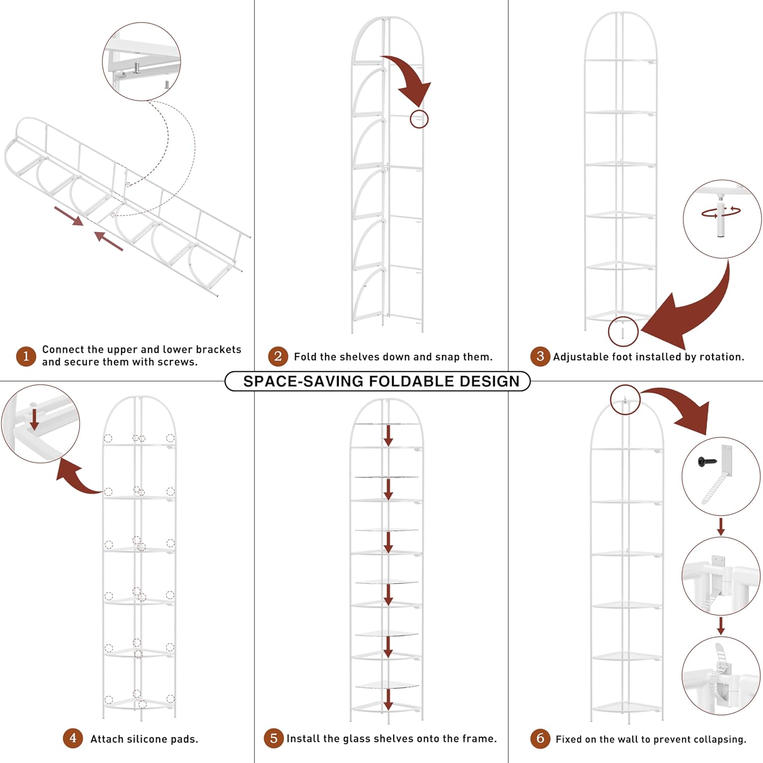 Crofy Foldable 6 Tier Corner Shelf, Metal Corner Plant Stand with White Frame and Transparent Shelves, Corner Display Rack Multipurpose Shelving Unit for Living Room, Bedroom, Bathroom