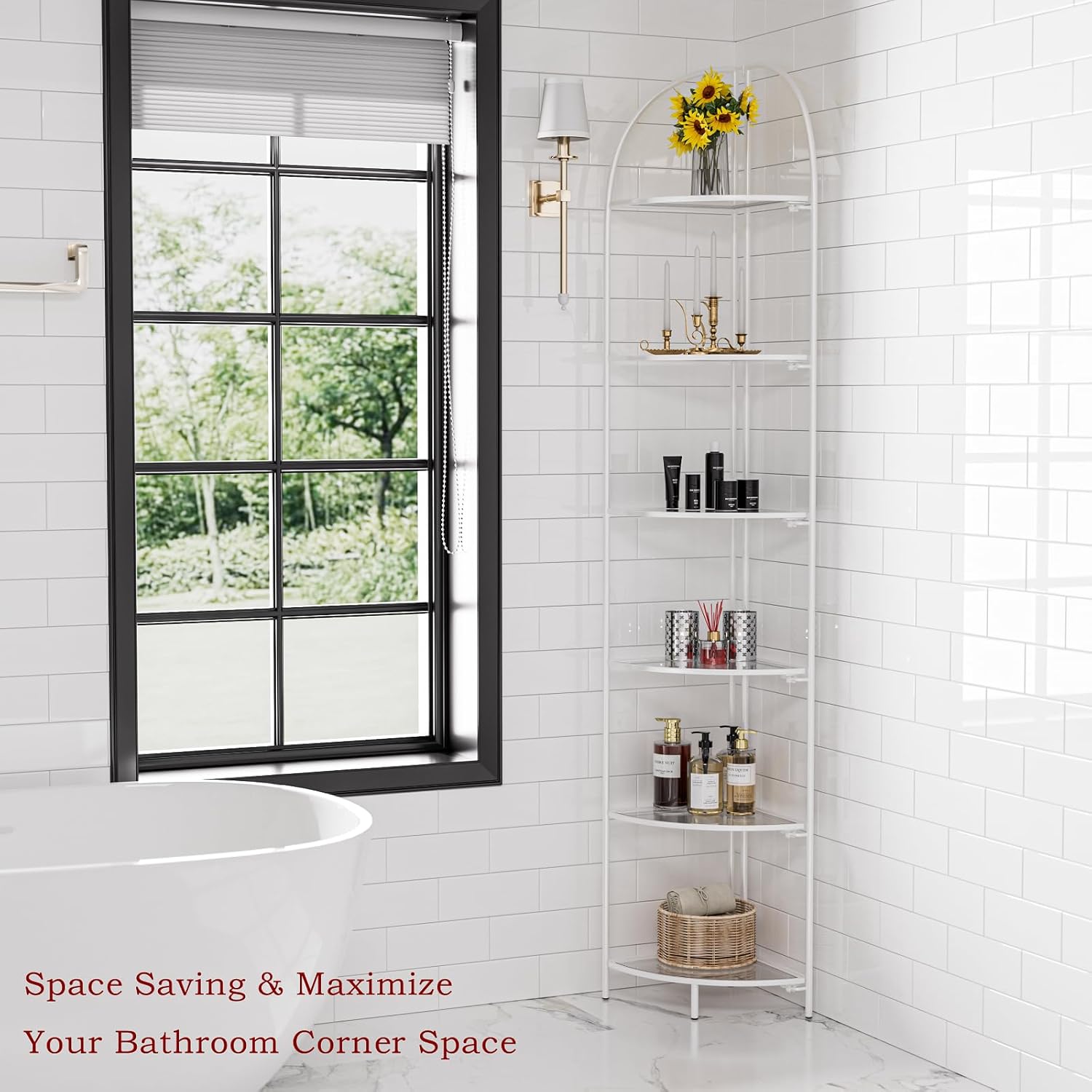 - 【Large Storage Capacity Corner Shelves】The height of the 6-tier corner shelf stand is 83.9 inches, the shelf radius is 12.8 inches, and the space between shelves is 13.1 inches, this tall shelf provides you with ample storage space to store Your books, photo frames, decorations, centerpieces, potted plants and other household items.