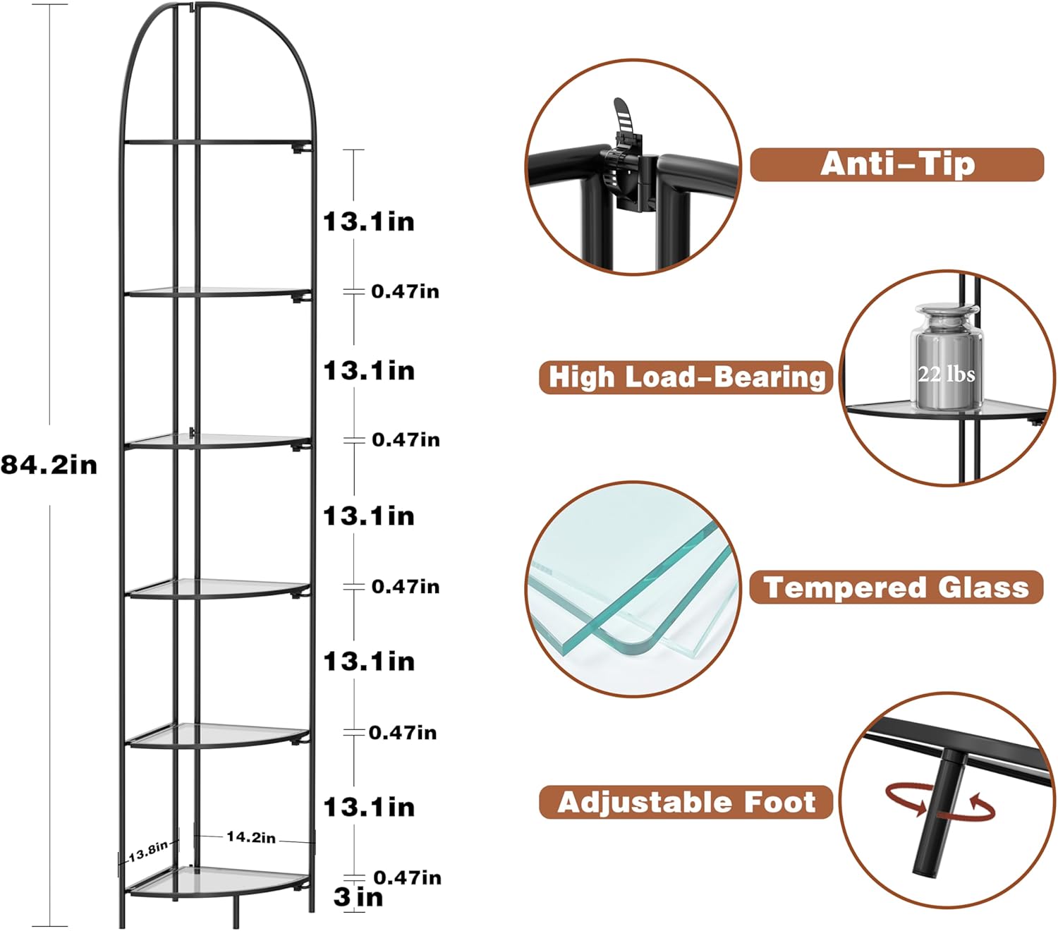 - 【Large Storage Capacity Corner Shelves】The height of the 6-tier corner shelf stand is 83.9 inches, the shelf radius is 12.8 inches, and the space between shelves is 13.1 inches, this tall shelf provides you with ample storage space to store Your books, photo frames, decorations, centerpieces, potted plants and other household items.
