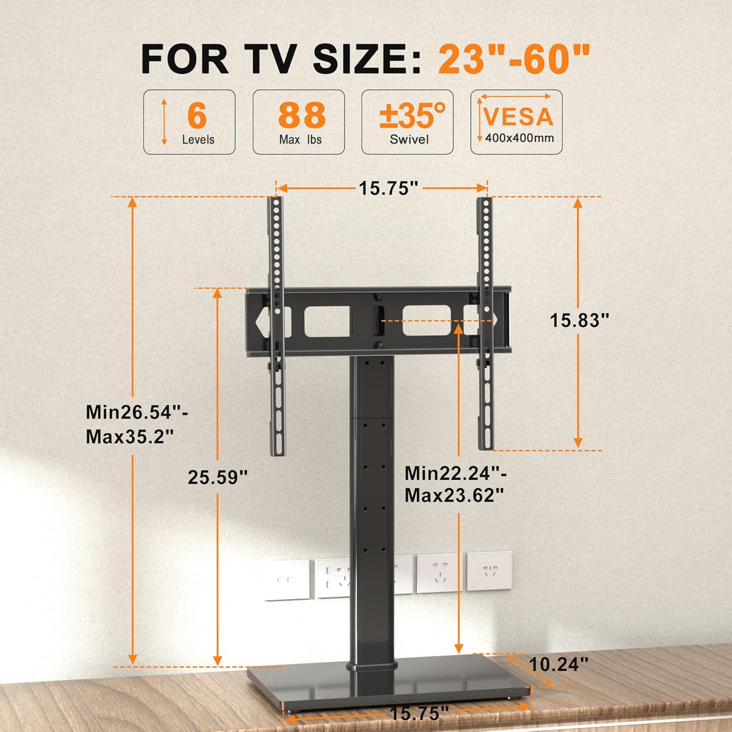 - 6 LEVEL HEIGHT ADJUSTMENT:This table top TV stand provides 3 options on hook and 2 options on pillar, max height 23.62β from the center of TV to the base (pillar height 25.59β)