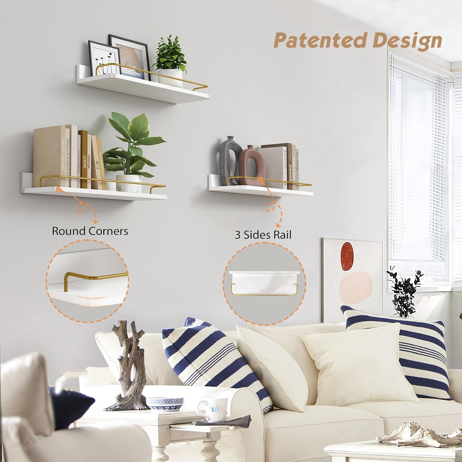 - Use Every Bit of Wall Space - Installing white and gold floating shelves (Size: 17"L x 6"D x 2.2"H) set of 3 can help you add both storage and style to your bathroom, bedroom, closet, nursery etc., and they donβt need to take up a single square foot. Forbena Floating shelves bathroom can hold everything from daily essentials like skincare serums and washcloths to decorative items like indoor plants, fresh flowers or framed artwork.