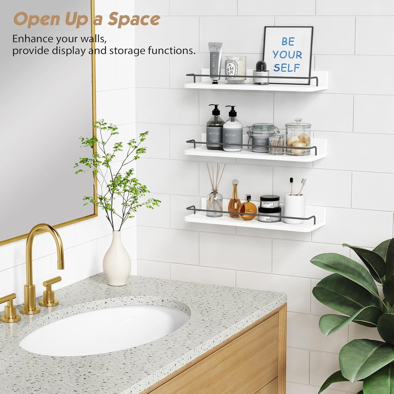 - Use Every Bit of Wall Space - Installing Forbena floating shelves (Size: 17"L x 6"D x 2.2"H) set of 3 can help you add both storage and style to your bathroom, closet, nursery etc., and they donβt need to take up a single square foot. Forbena Floating shelves bathroom can hold everything from daily essentials like skincare serums and washcloths to decorative items like indoor plants, fresh flowers or framed artwork.