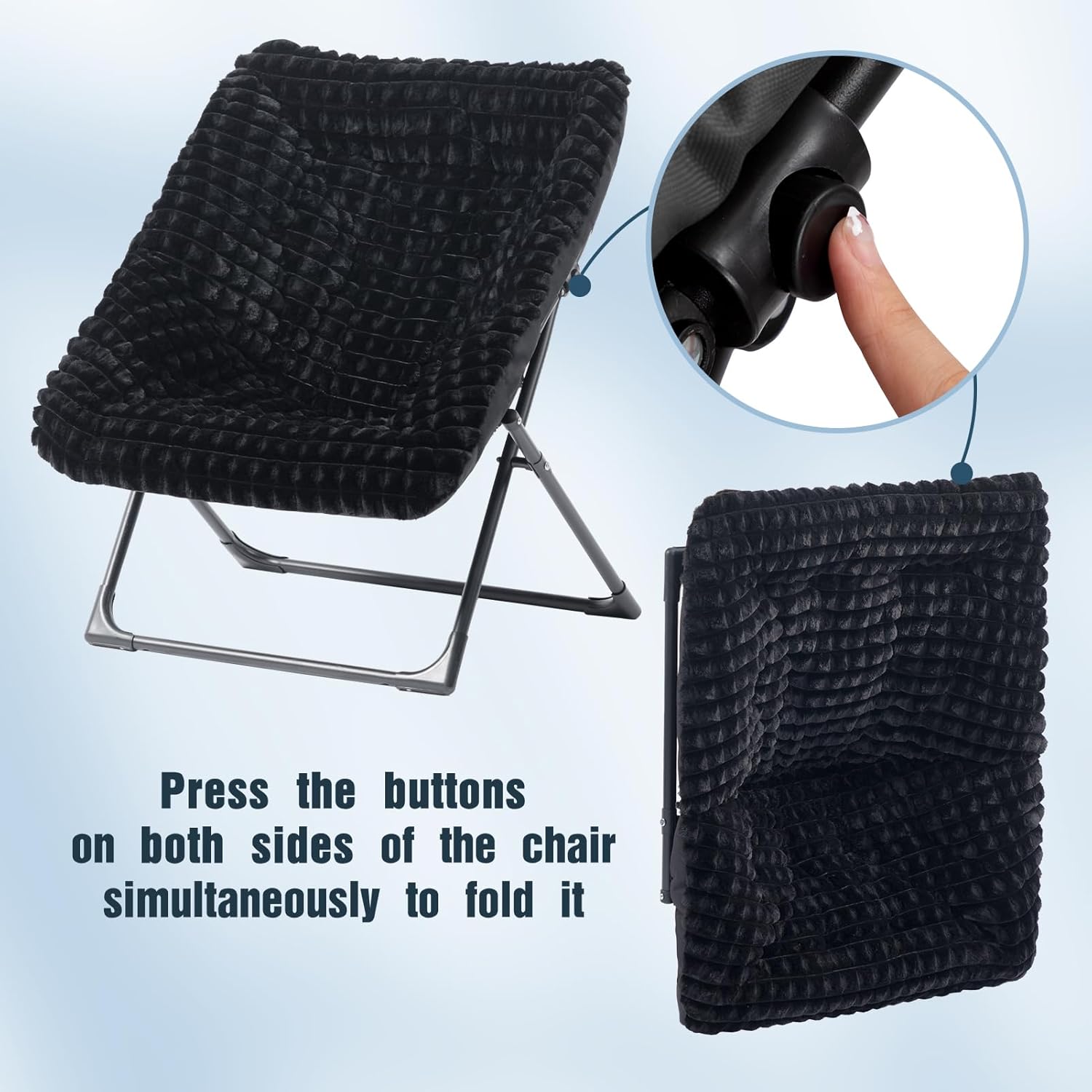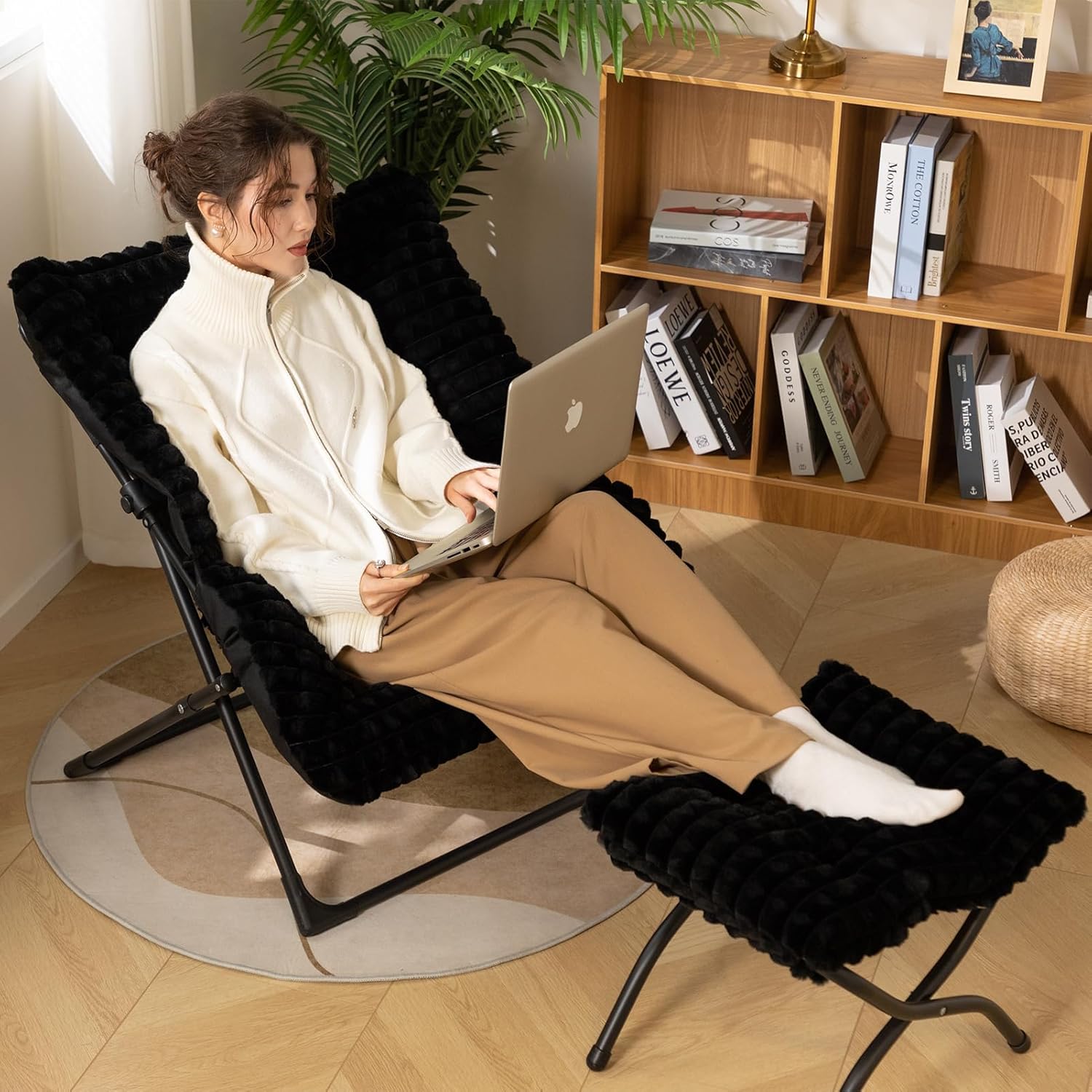 HollyHOME X-Large Saucer Chair with Foldable Ottoman, Comfy Oversized Folding Chair and Folding Footrest Stool Set, Faux-Fur Reading Chair and Footstool for Living Room, Bedroom, Black Chair&Stool