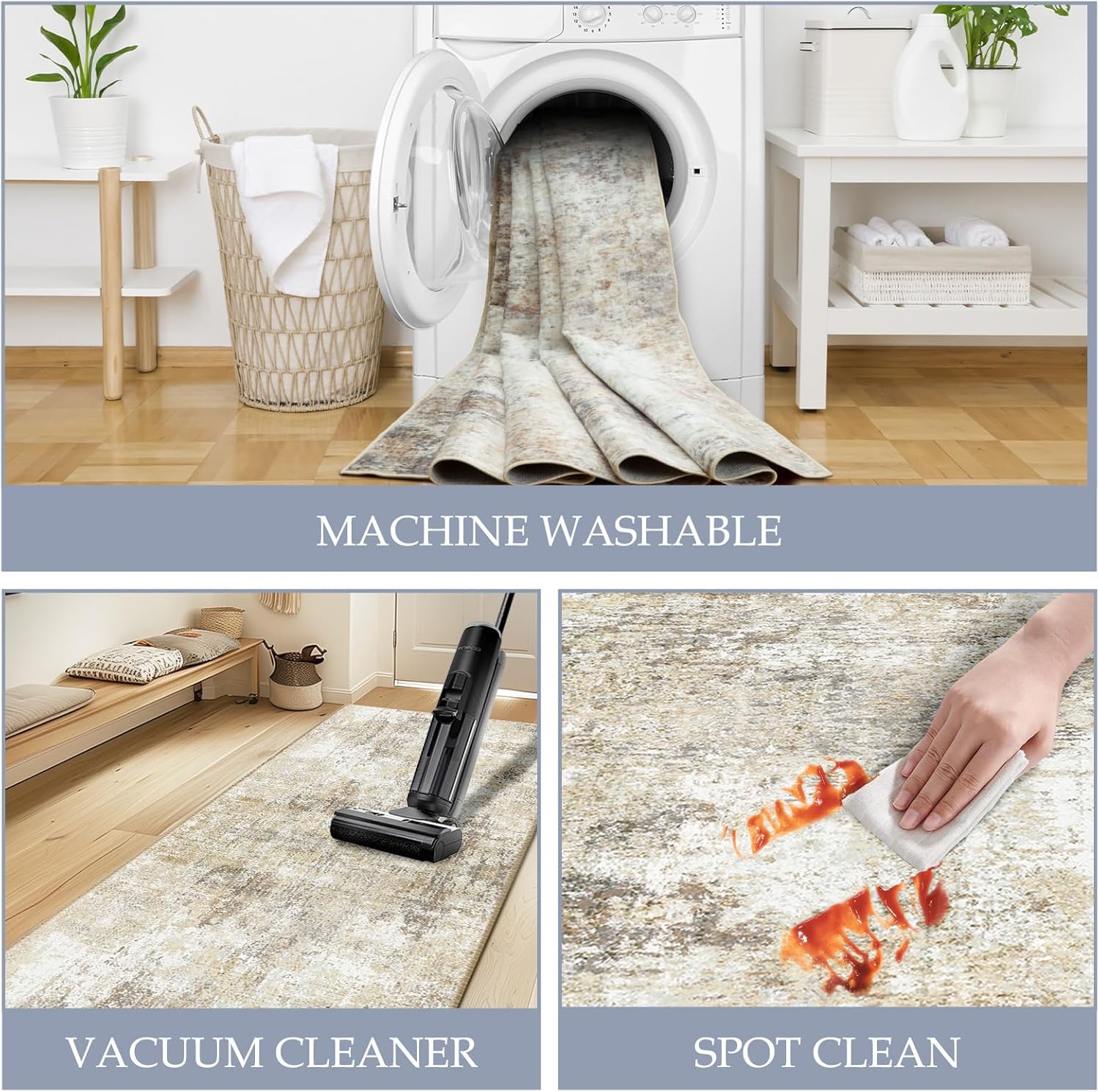 - Tides Series – Effortless style that flows with your life.This modern machine-washable non-slip rug features reinforced edges and a low-pile design that resists dirt. Its water-repellent surface makes spills easy to clean - liquids bead up for quick wiping. Simply machine wash in cold water (no bleach) to refresh. The non-slip backing keeps it securely in place. A perfect blend of function and contemporary design for active homes.