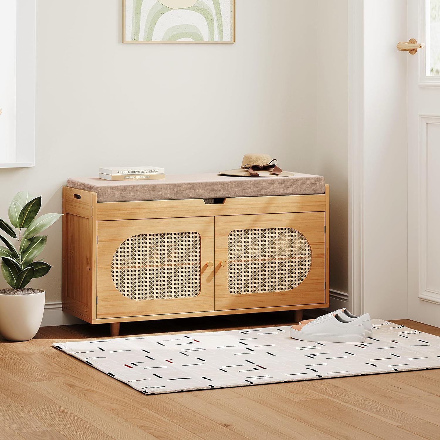Rattan Shoe Storage Bench,Bamboo Entryway Bench, 2-Tier Shoe Rack,35.4" W x 12.6" D x 19.7" H with 2 Doors & Padded Seat Cushion for Entryway, Living Room, Bedroom, Natural
