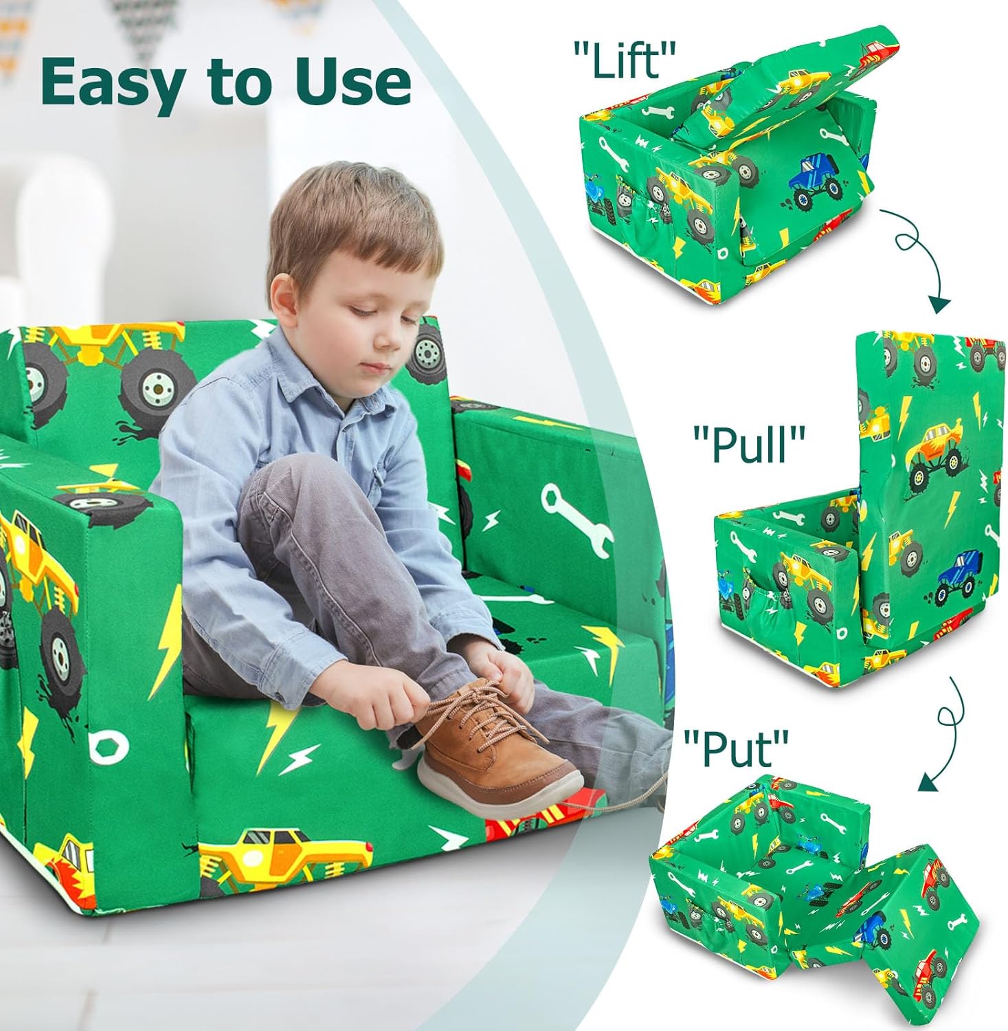 Kids Couch, 2-in-1 Kids Fold Out Sofa, Convertible Toddler Couch to Lounger for Girls and Boys, Soft Toddler Chairs Comfy 1-3 Years Old (Green Monster Truck)