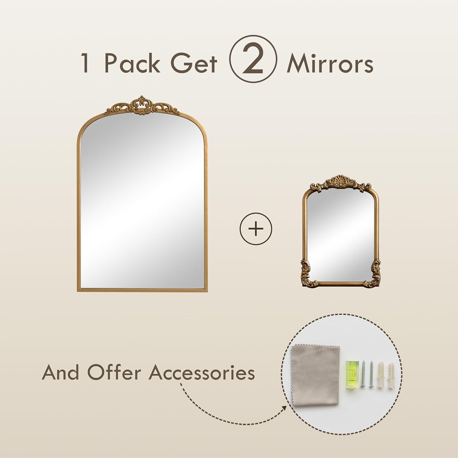 1 Set Vintage Mirror 20x30 Gold Antique Baroque Arched Ornate Traditional Brass Mirror and 8.5x12 Vintage Vanity Makeup Desk Table Mirror for Bathroom Entryway Living Room Hallway Fireplace