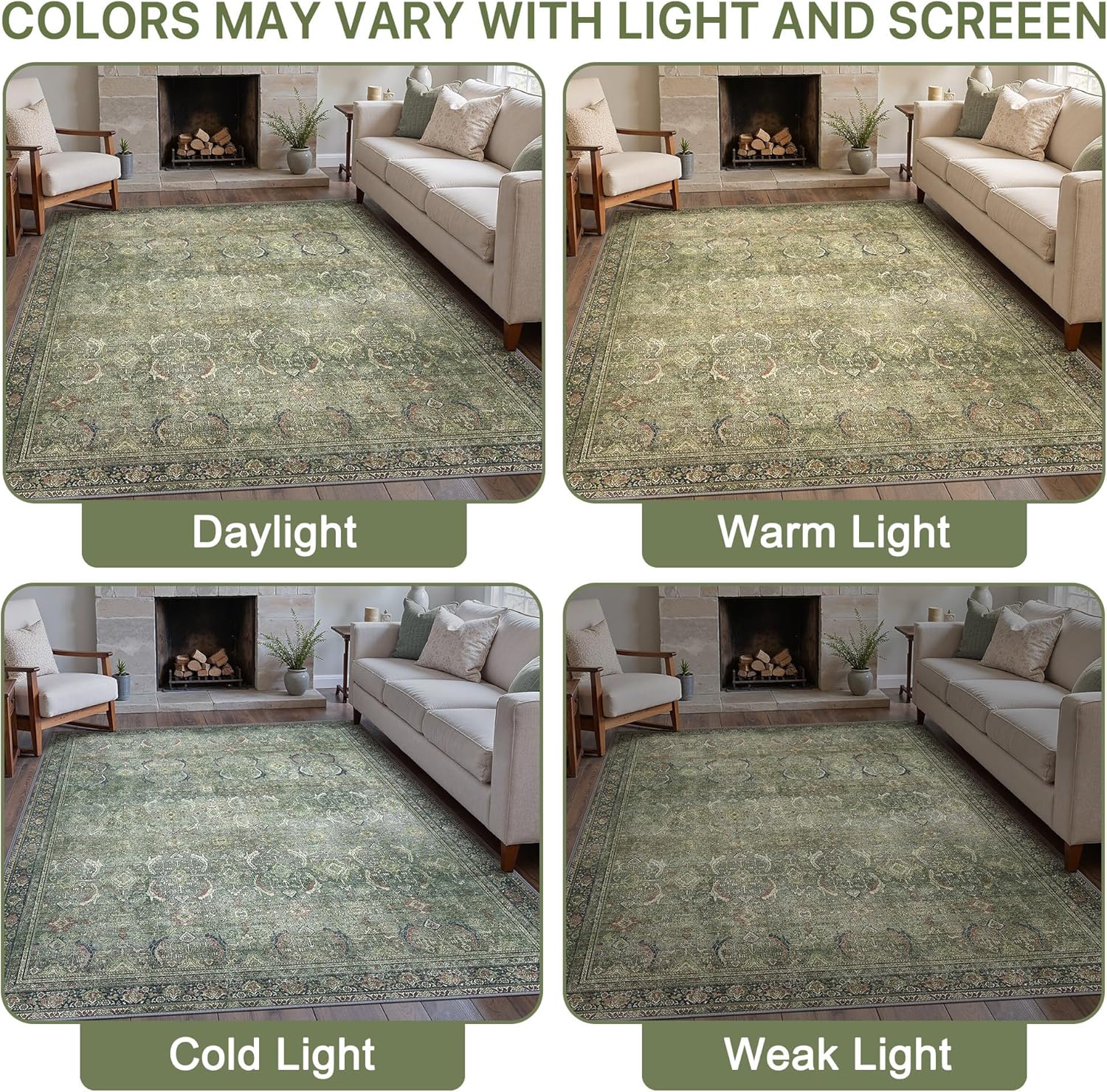 - Timeless Vintage Design:This green rug elegantly combines a timeless floral design with a muted color palette to infuse your living space with a touch of vintage charm. Its unique texture and patterns add a layer of sophistication and comfort to any room, making it a versatile addition to both modern and traditional decors.