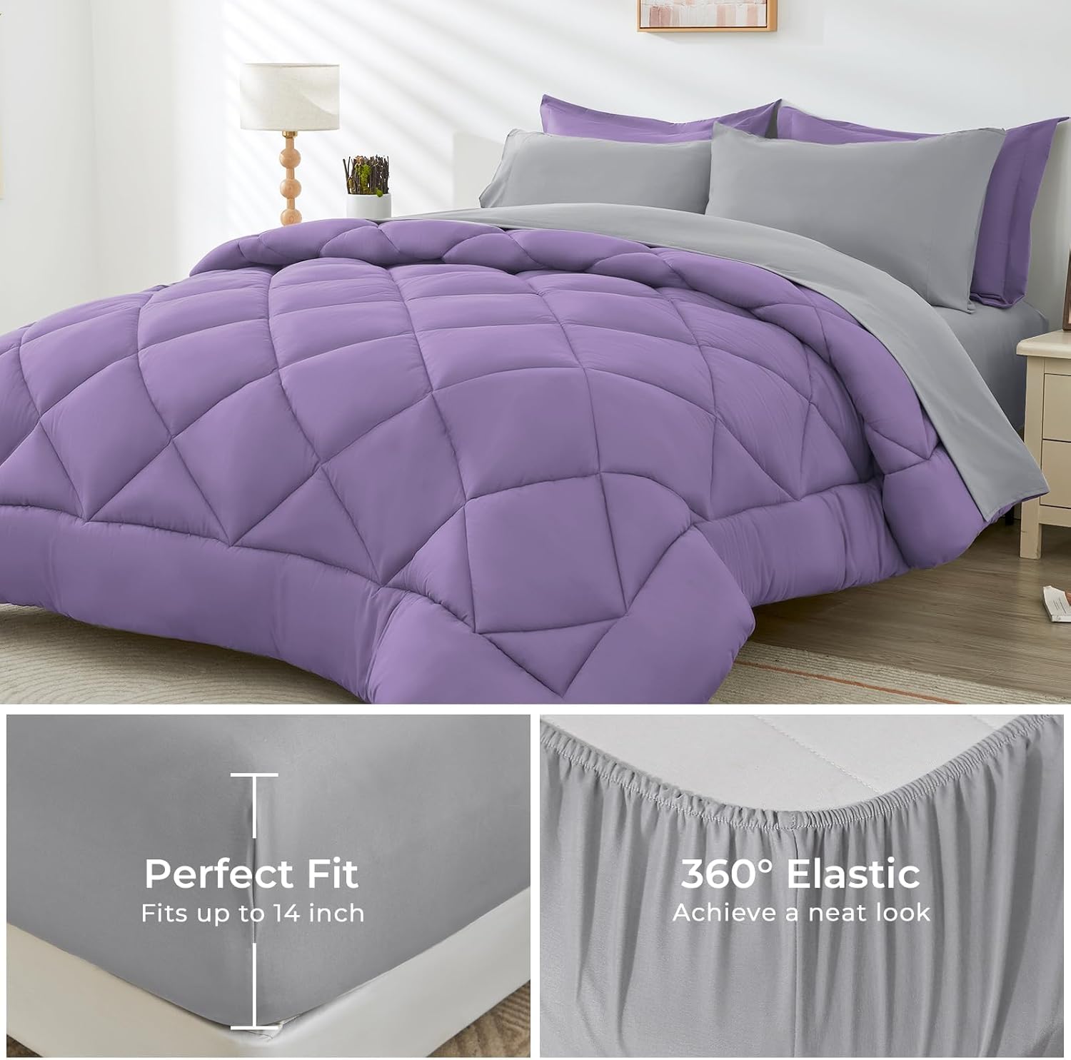 HEVUMYI King Comforter Set - 7-Piece All Season Bed in a Bag King, Ultra Soft Bedding Set with Comforter, Flat Sheet, Fitted Sheet, Pillowcases, Pillow Shams, Purple & Light Grey
