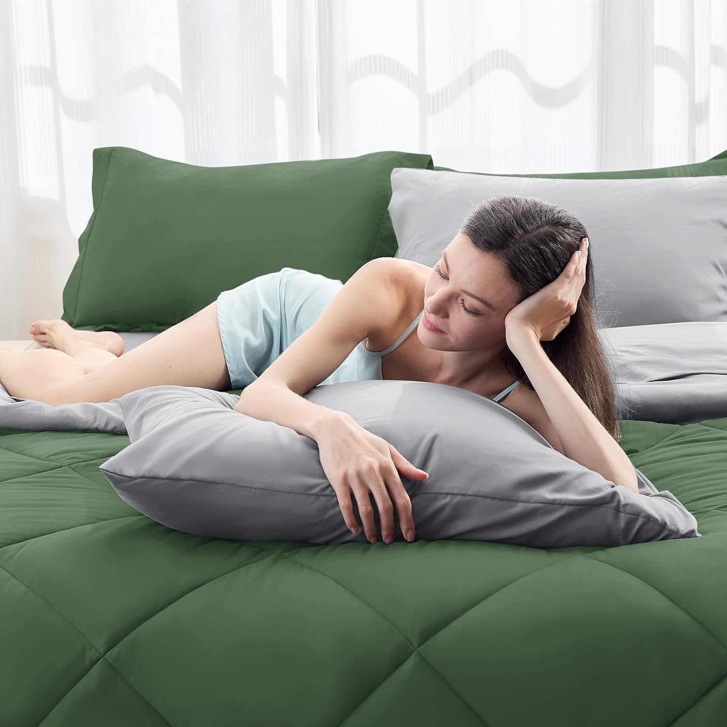 HEVUMYI Full Comforter Set - 7-Piece All Season Bed in a Bag Full, Ultra Soft Bedding Set with Comforter, Flat Sheet, Fitted Sheet, Pillowcases, Pillow Shams, Green & Light Grey