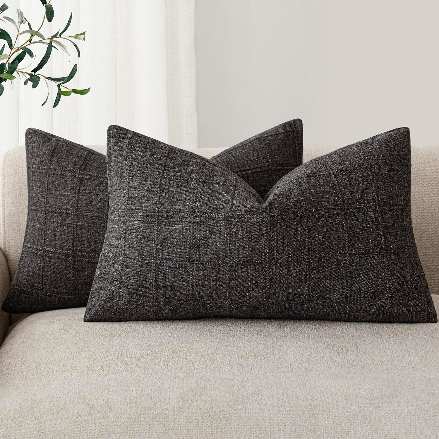 Foindtower Set of 2 Decorative Linen Check Throw Pillow Covers Neutral Farmhouse Lumbar Cushion Covers Modern Boho Home Decor for Sofa Chair Couch Bedroom Living Room Outdoor,12×20 Inch,Charcoal