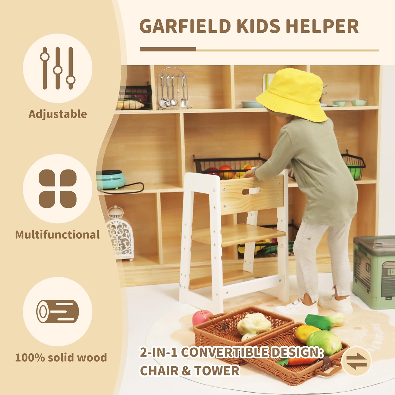 - MULTIFUNCTIONAL USE: This wooden GARFIELD step stool and counter helper not only allows your child to reach high places, it is also a versatile tool that can grow with your child. It is perfect for helping in the kitchen, reaching to the sink to brush teeth, or even potty training, and supports your child's independence in a safe way. It can also be used as a toddler chair and kid chair for different ages