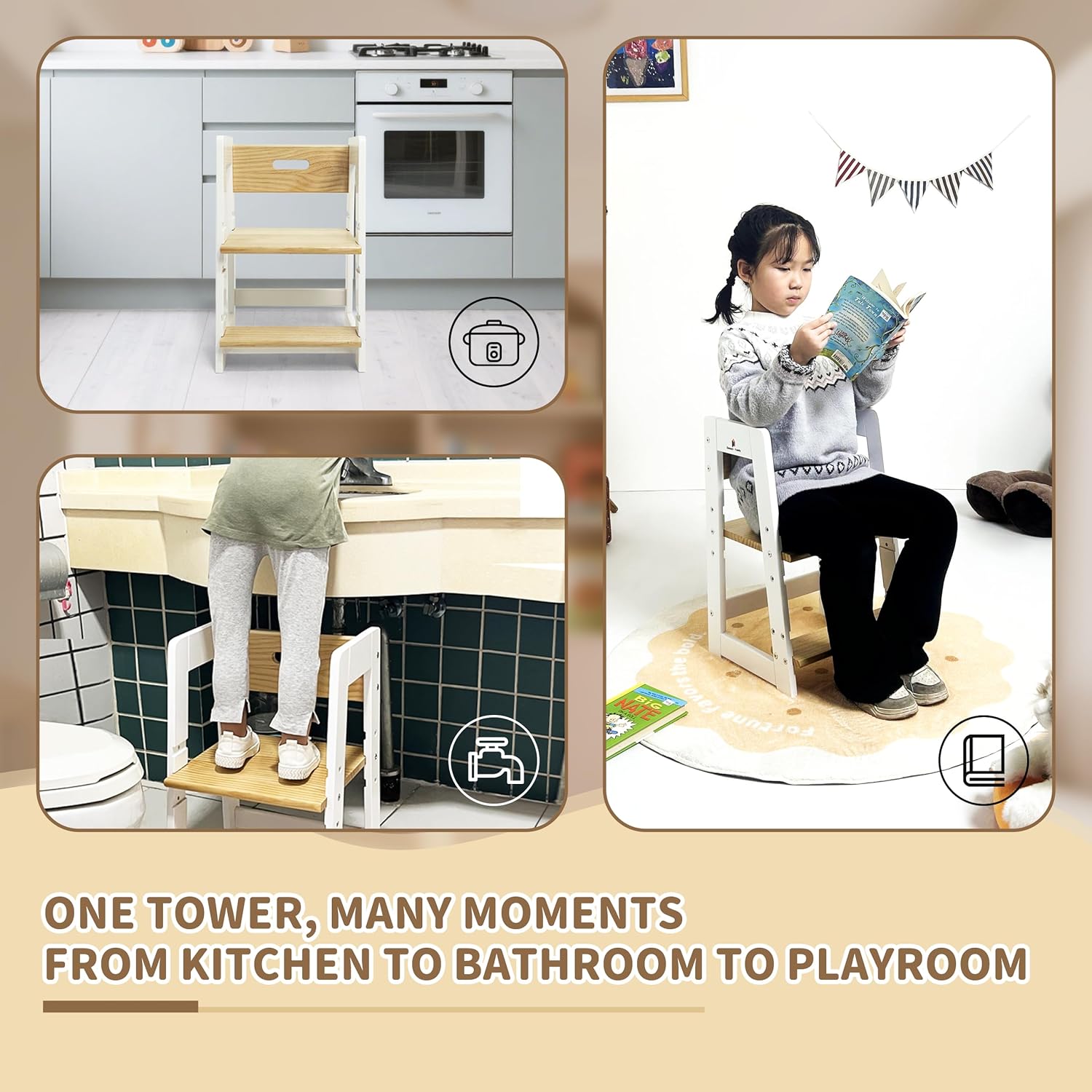 - DURABLE AND SAFE CONSTRUCTION: This adjustable kids chair and kitchen stool is made of high-quality New Zealand pinewood, which is sturdy, durable and safe. The solid structure ensures stability, while the smooth edges and non-toxic paint finish guarantee a safe experience for children. The learning helper is perfect for daily use in various household scenarios