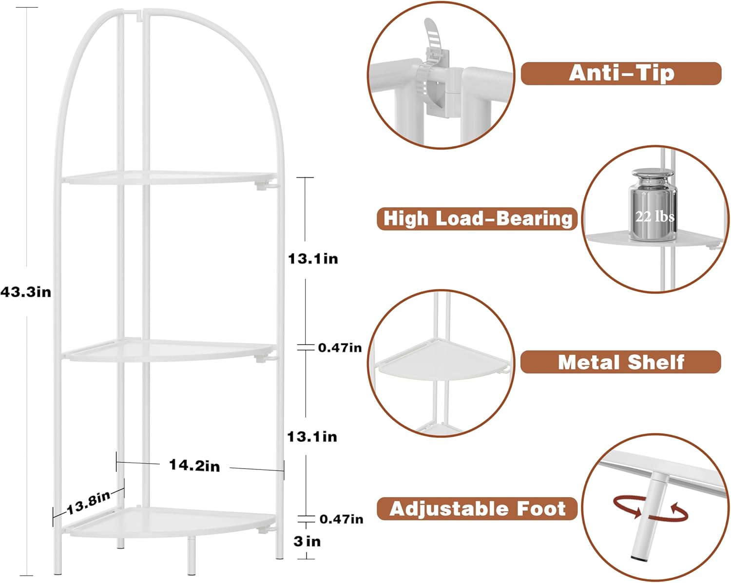 - 【Large Storage Capacity Corner Shelves】The height of the 3-tier corner shelf stand is 43.3 inches, the shelf radius is 12.8 inches, and the space between shelves is 13.1 inches, this tall shelf provides you with ample storage space to store Your books, photo frames, decorations, centerpieces, potted plants and other household items.