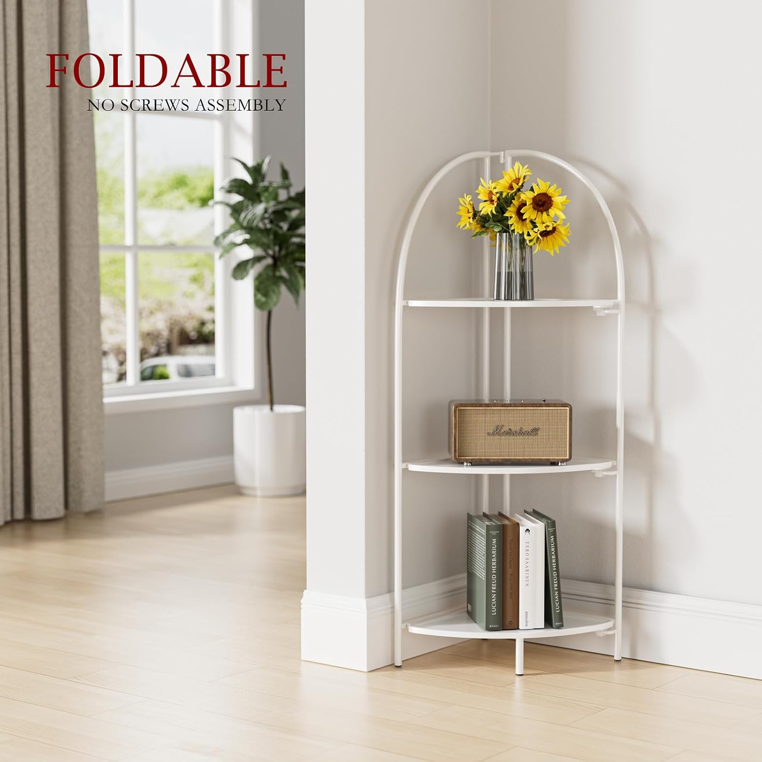 Crofy Foldable 3 Tier Corner Shelf, Metal Corner Plant Stand with White Frame and White Shelves, Corner Display Rack Multipurpose Shelving Unit for Living Room, Bedroom, Bathroom
